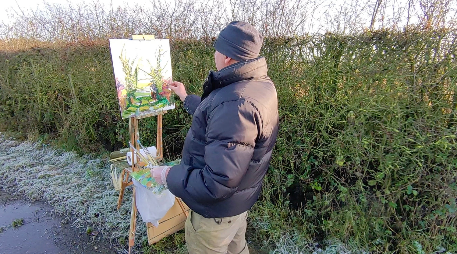 Based in North Yorkshire, I work outdoors throughout the seasons, returning to familiar lanes, trees and stretches of open ground to observe how they shift with light, weather and time. My paintings begin in direct response to the landscape itself - standing within it, noticing its structure, and allowing colour and composition to emerge from close observation.