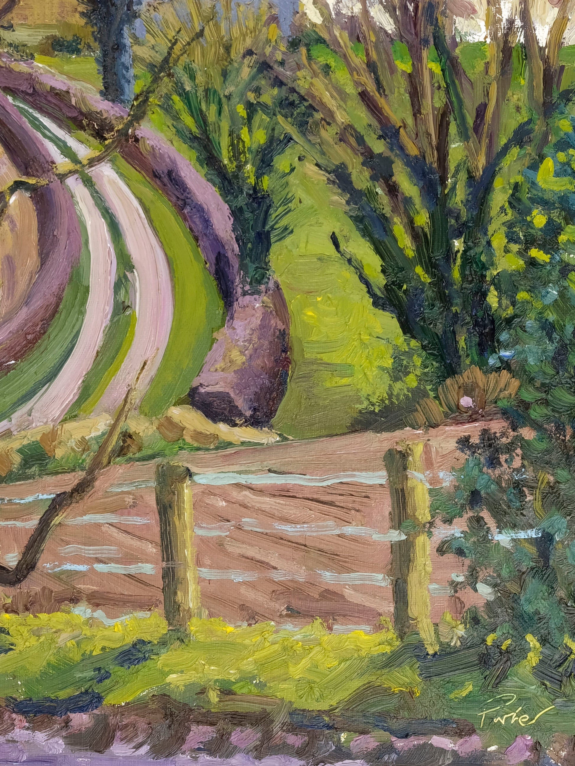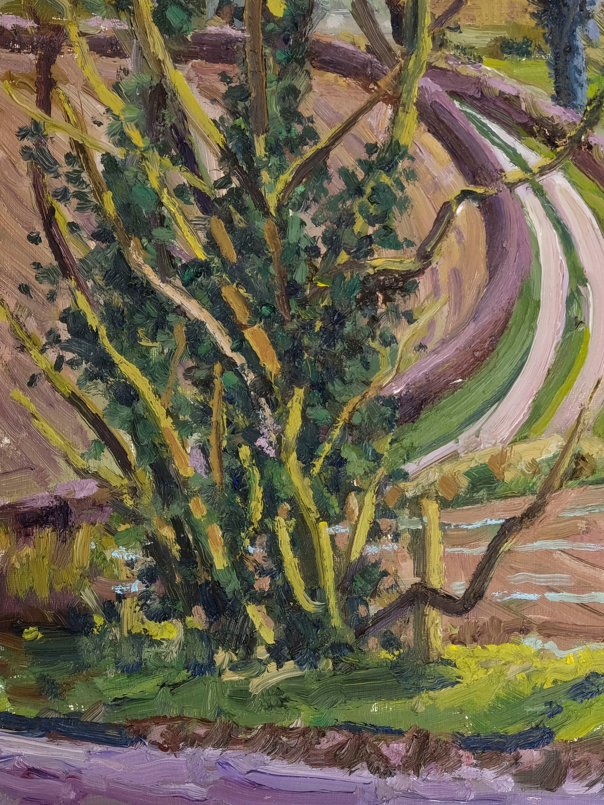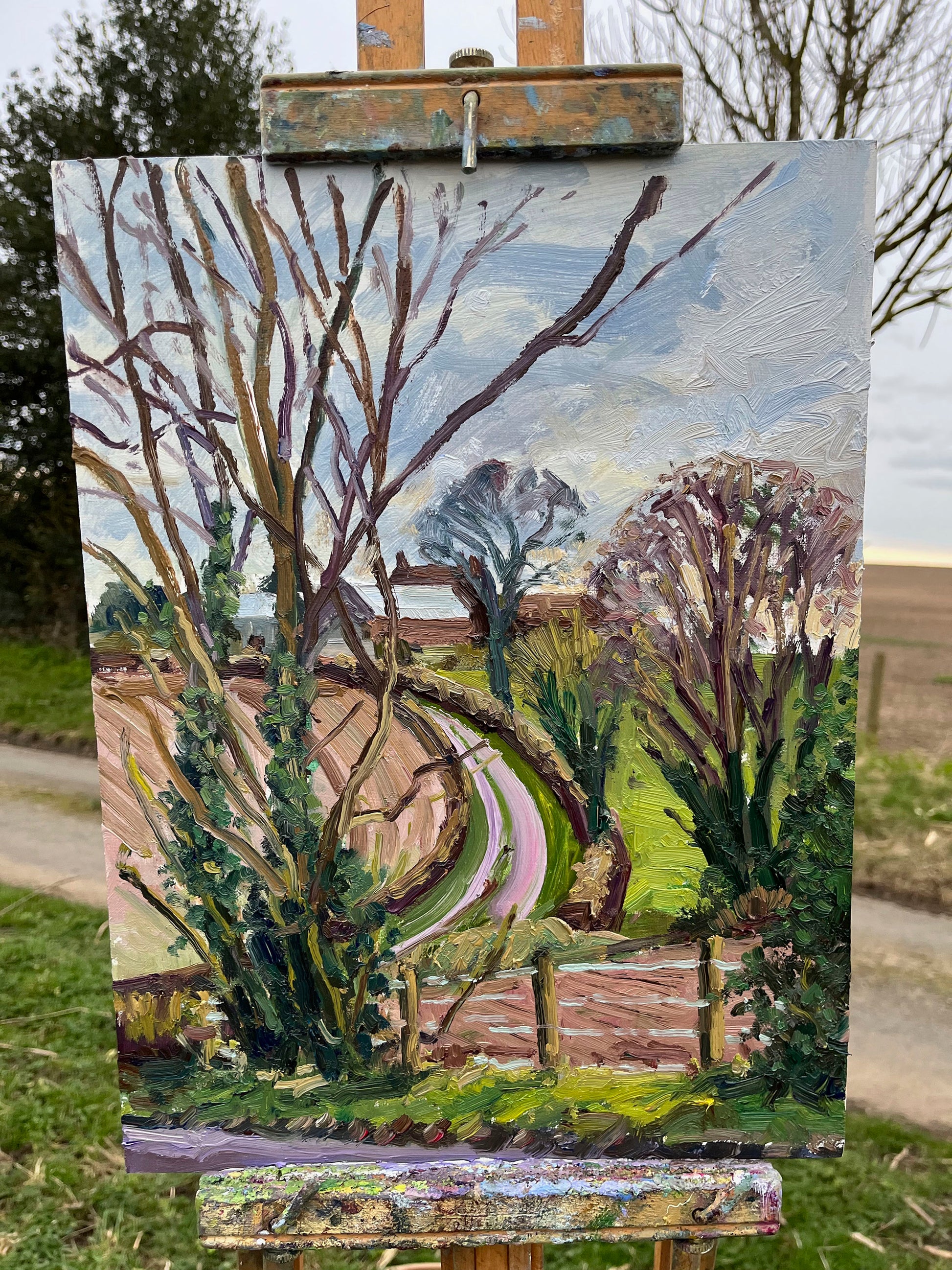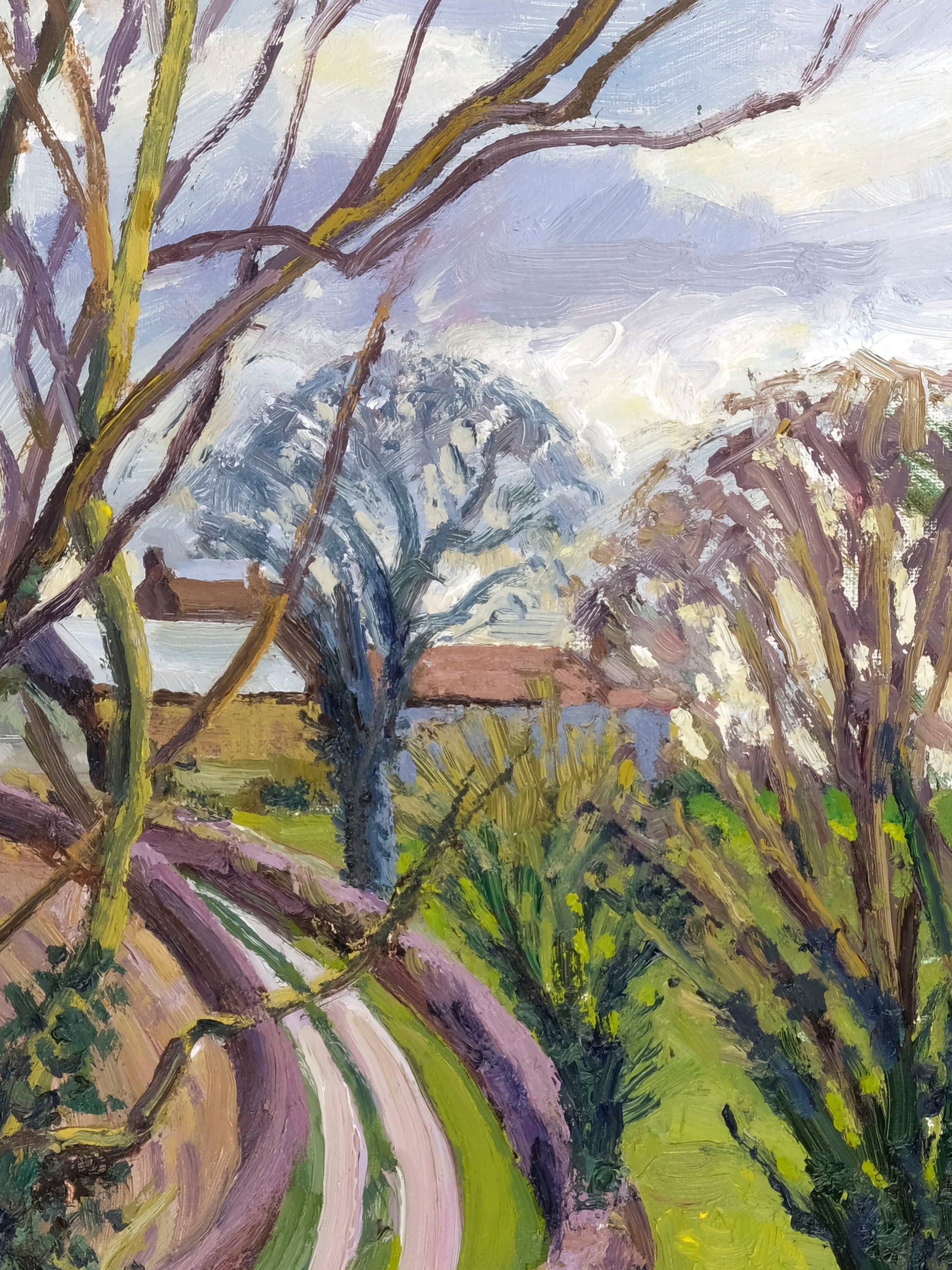 Painted en plein air on a cloudy, moody March afternoon, this piece captures a moment of quiet beauty on the winding Thornton Road. I was struck instantly by the composition—the way the lane curves uphill—and the striking mauves and purples in the road and hedgerows. I managed to capture the low sun as it briefly emerged, adding a fleeting touch of light.