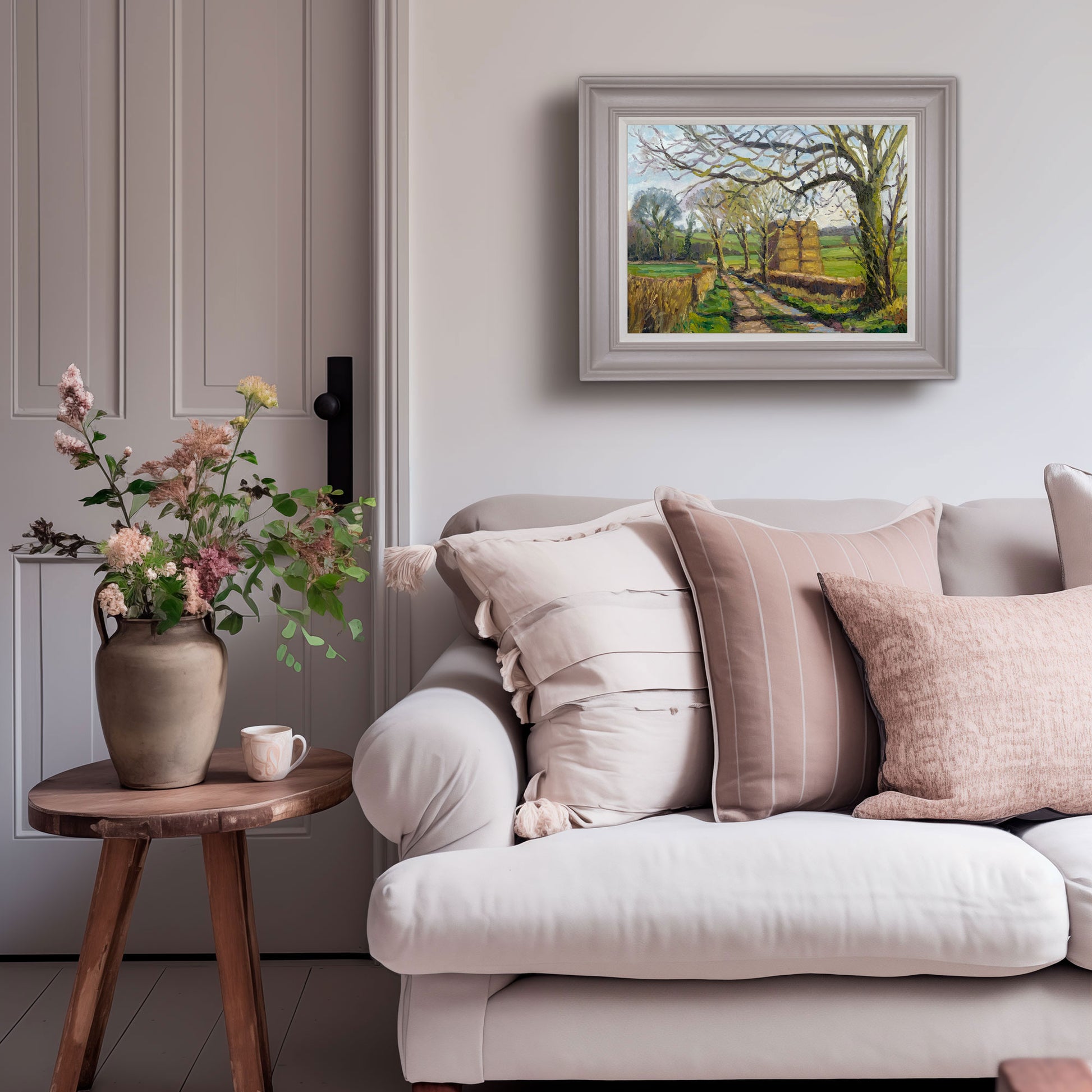 This painting is supplied framed in my signature 50mm scoop frame, hand-finished in Farrow & Ball “Elephant’s Breath” with a “Pointing” slip inset.