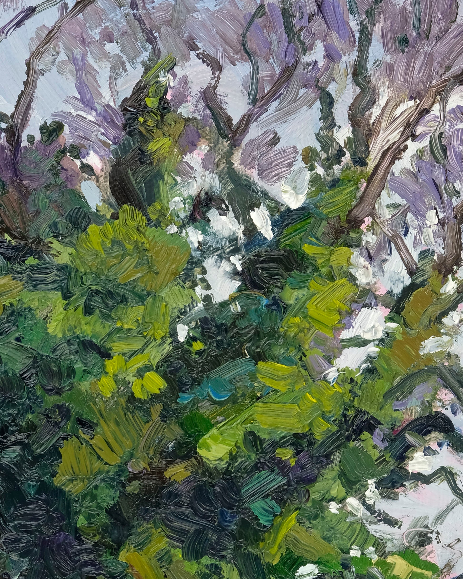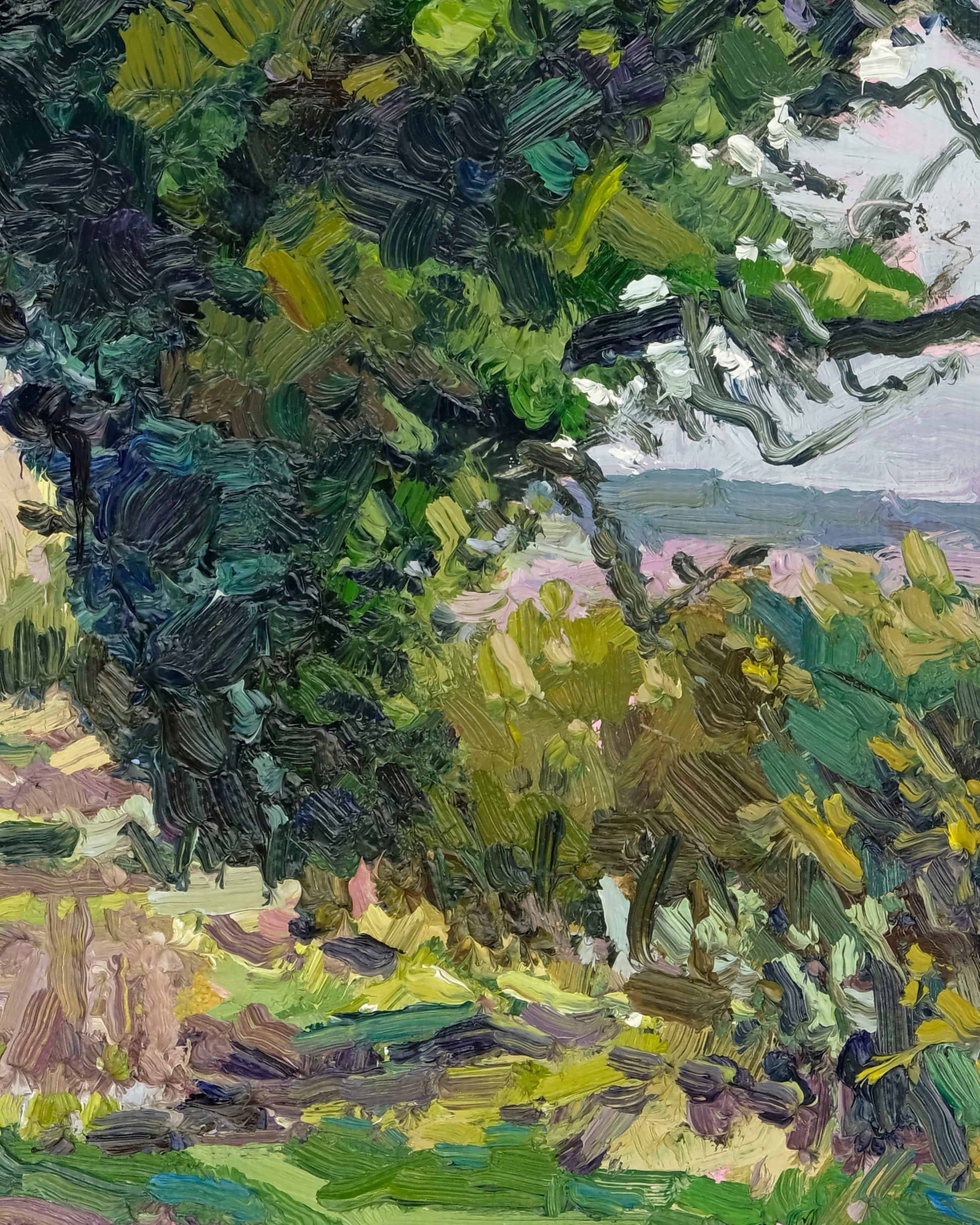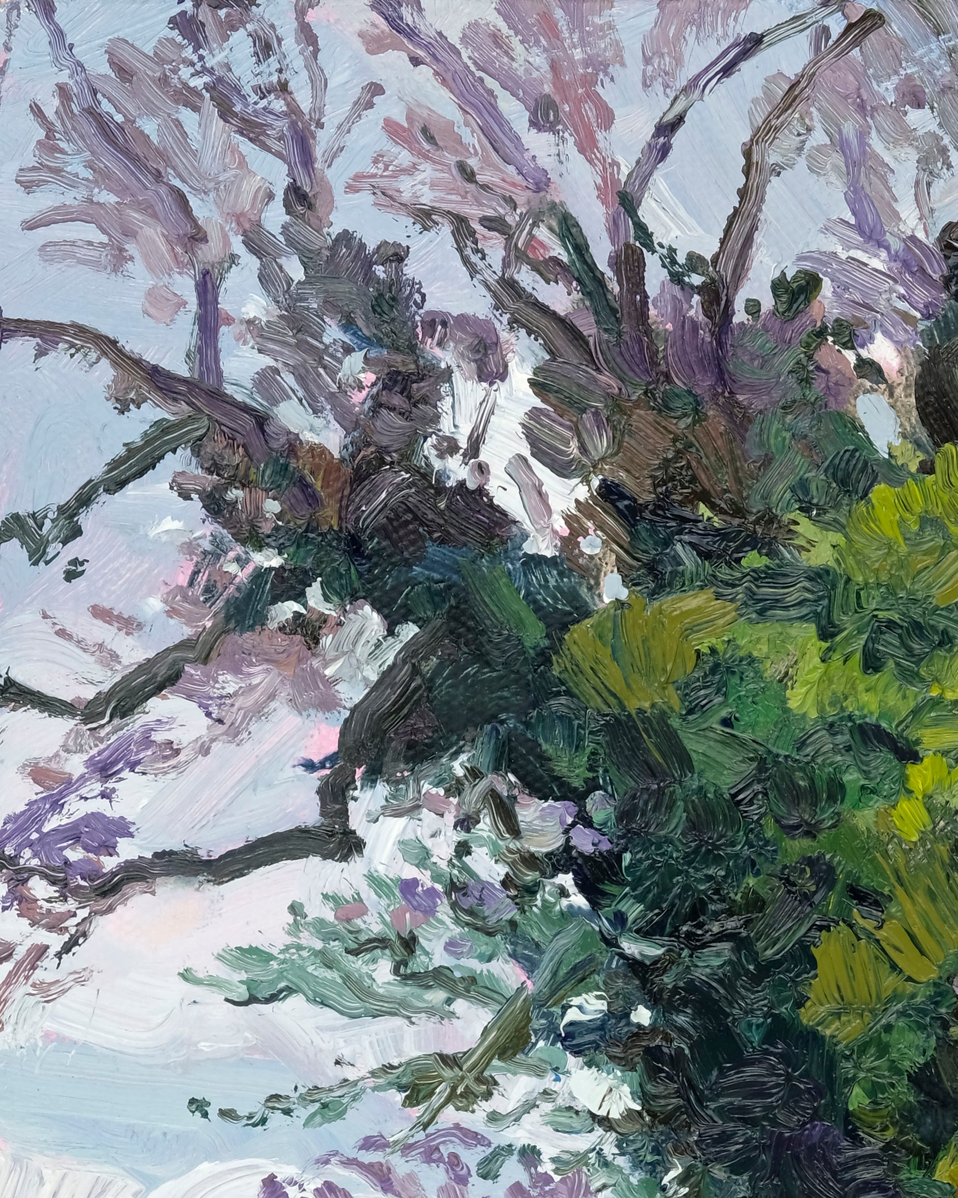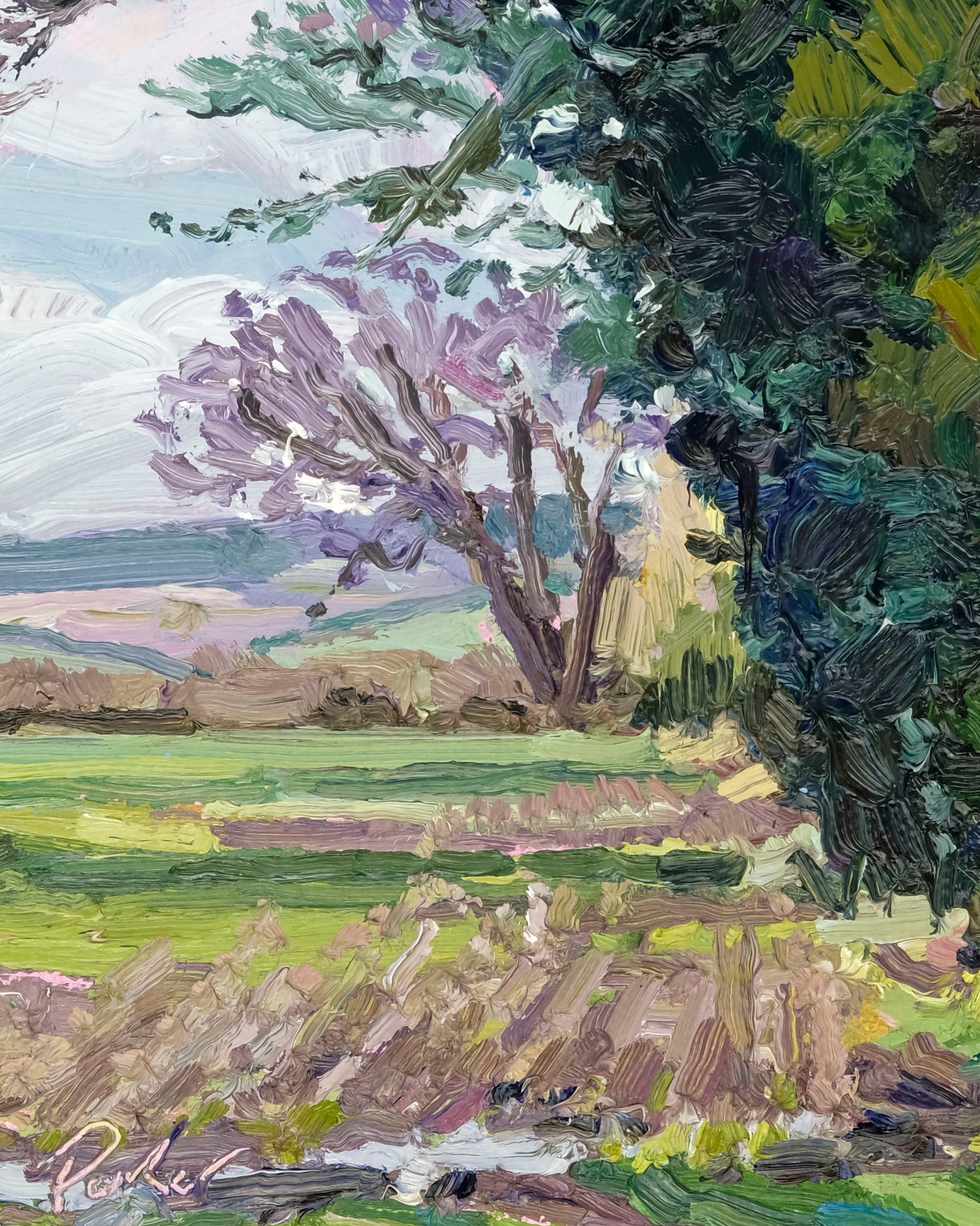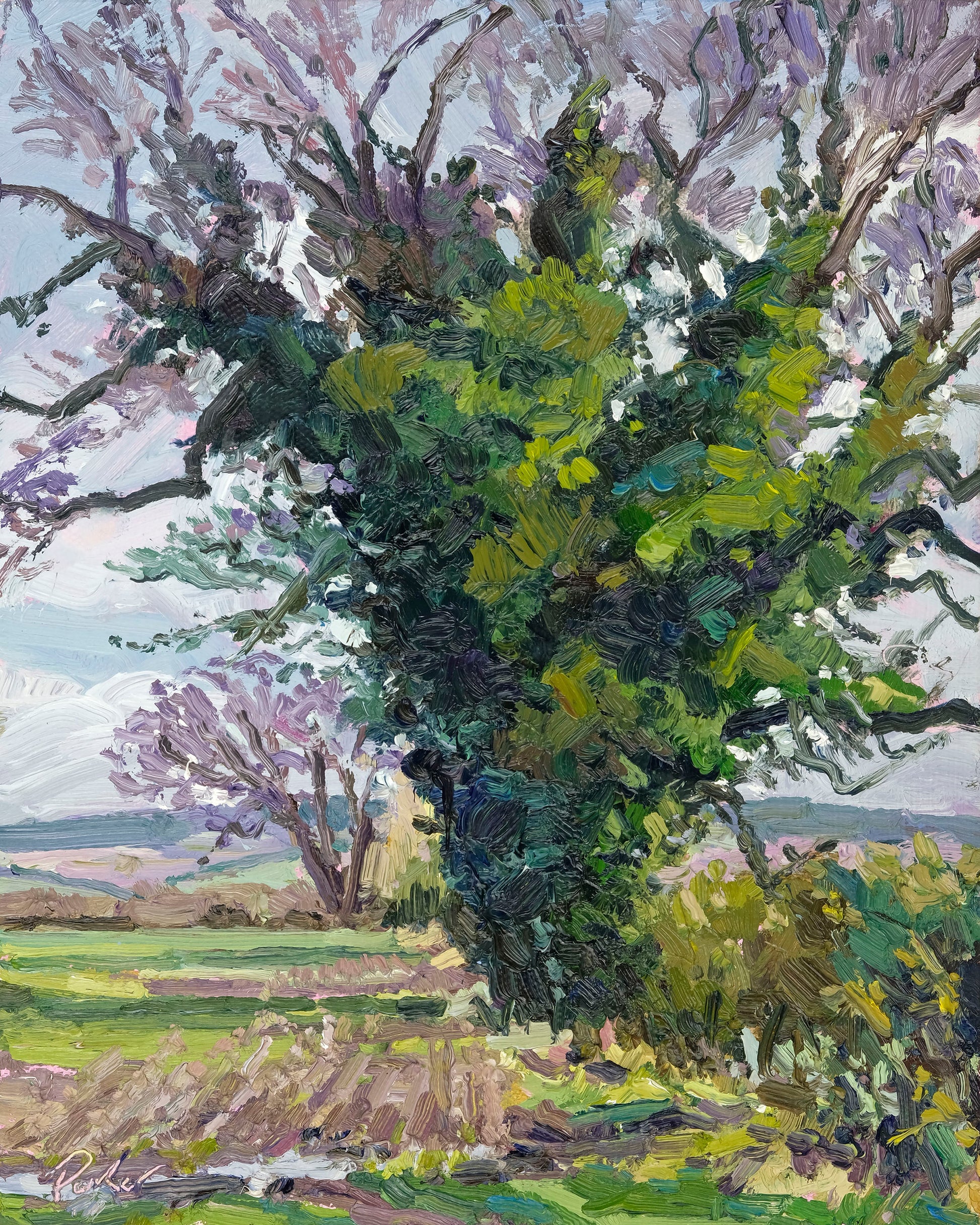 A small, expressive study of a favourite oak tree in Late Winter just as signs of Spring are beginning to emerge and there's a subtle change in colour and light. The painting features bold, thick impasto brushwork capturing the variety of greens and purples in the landscape.