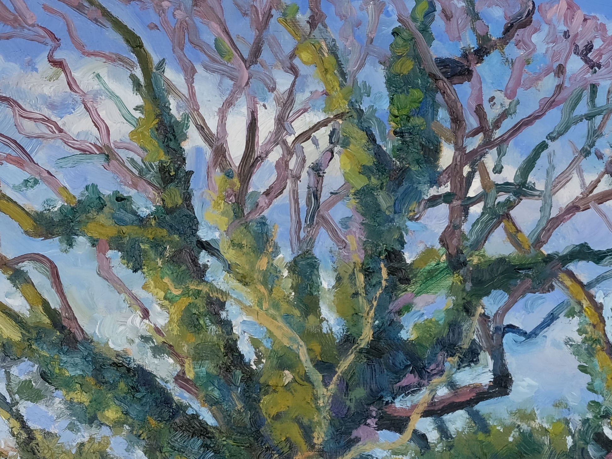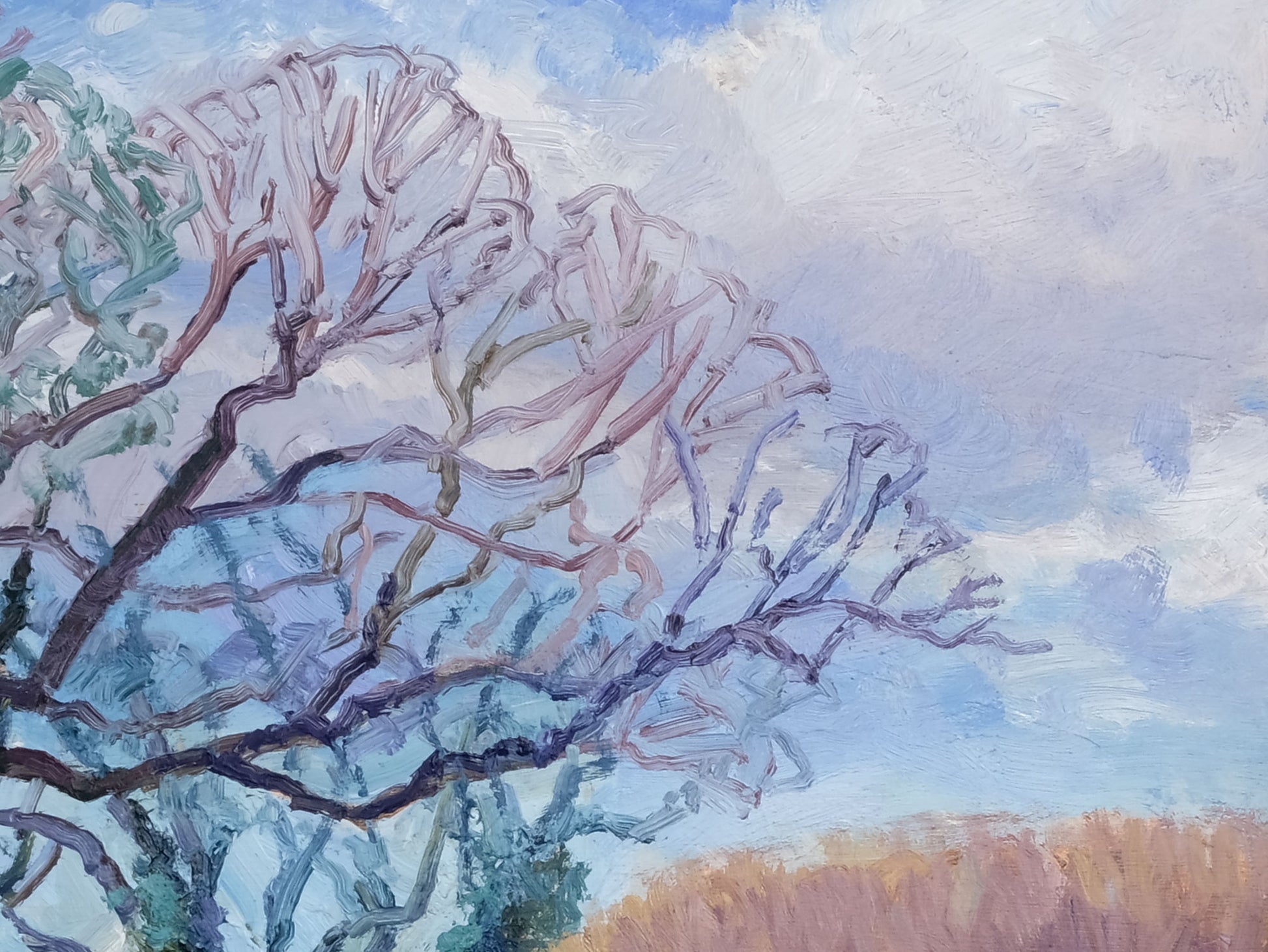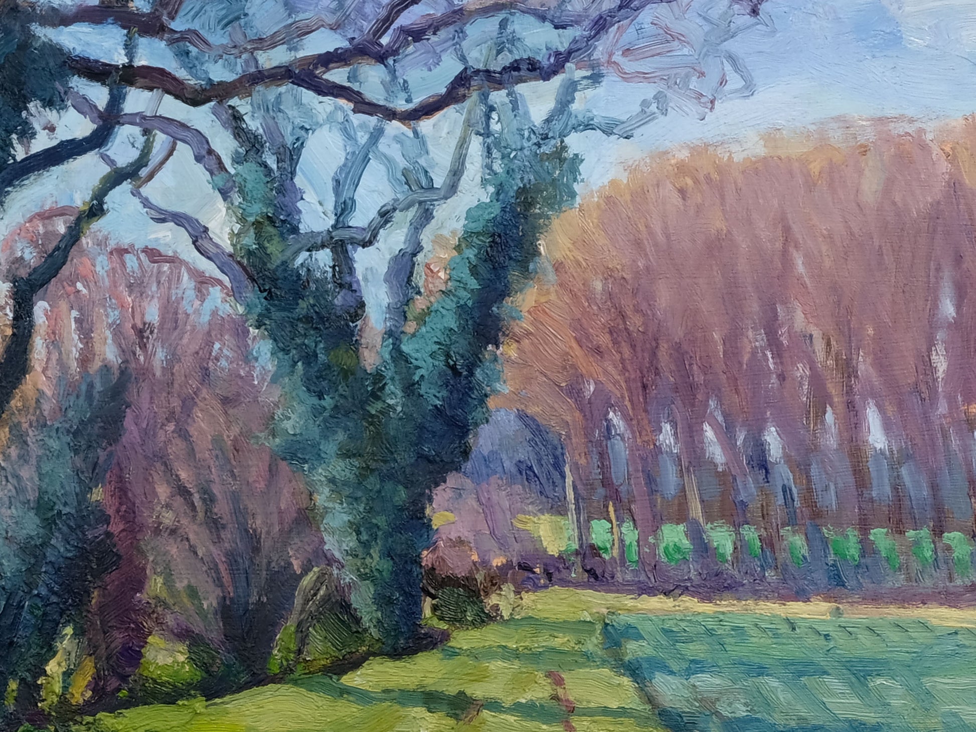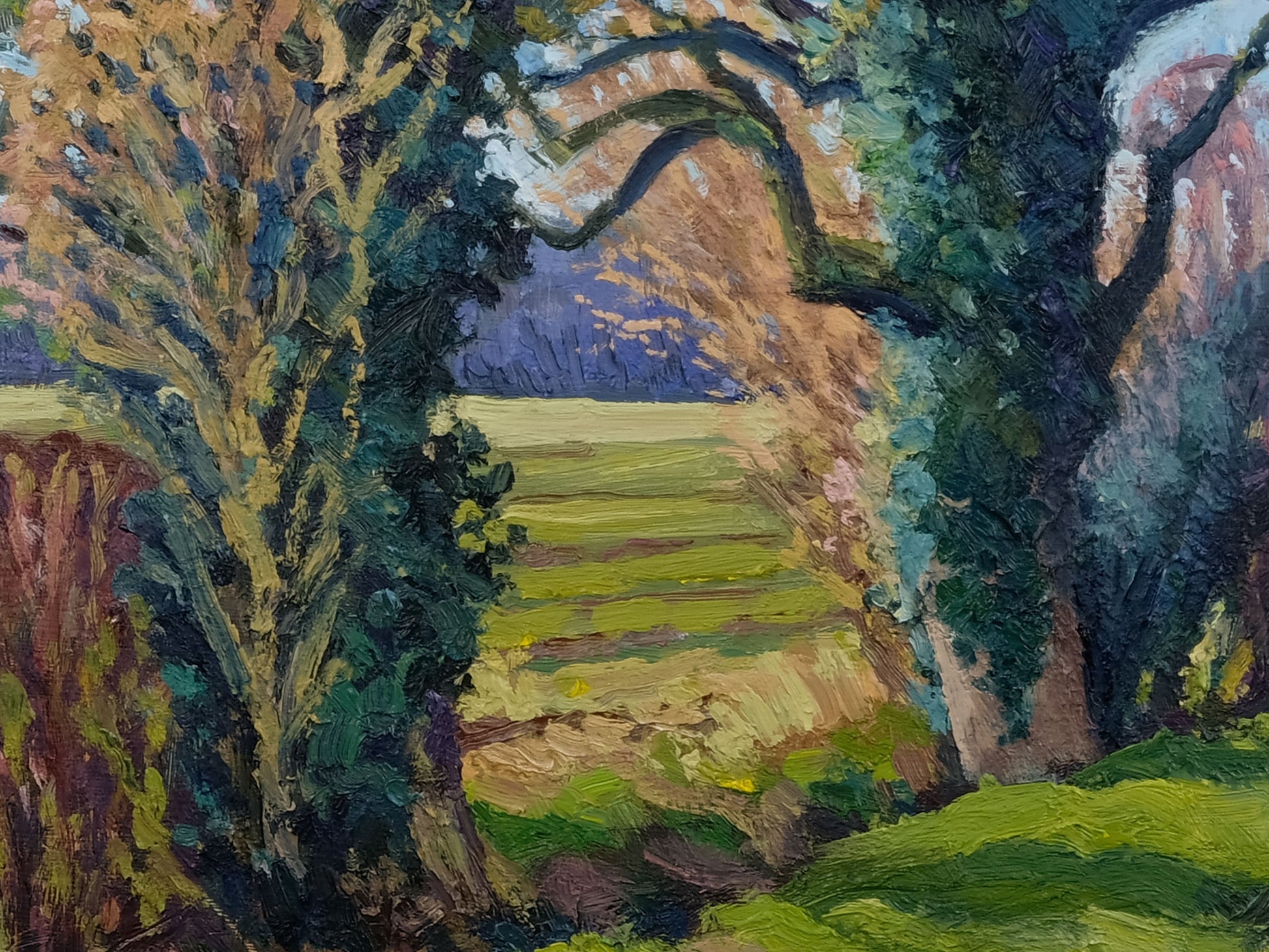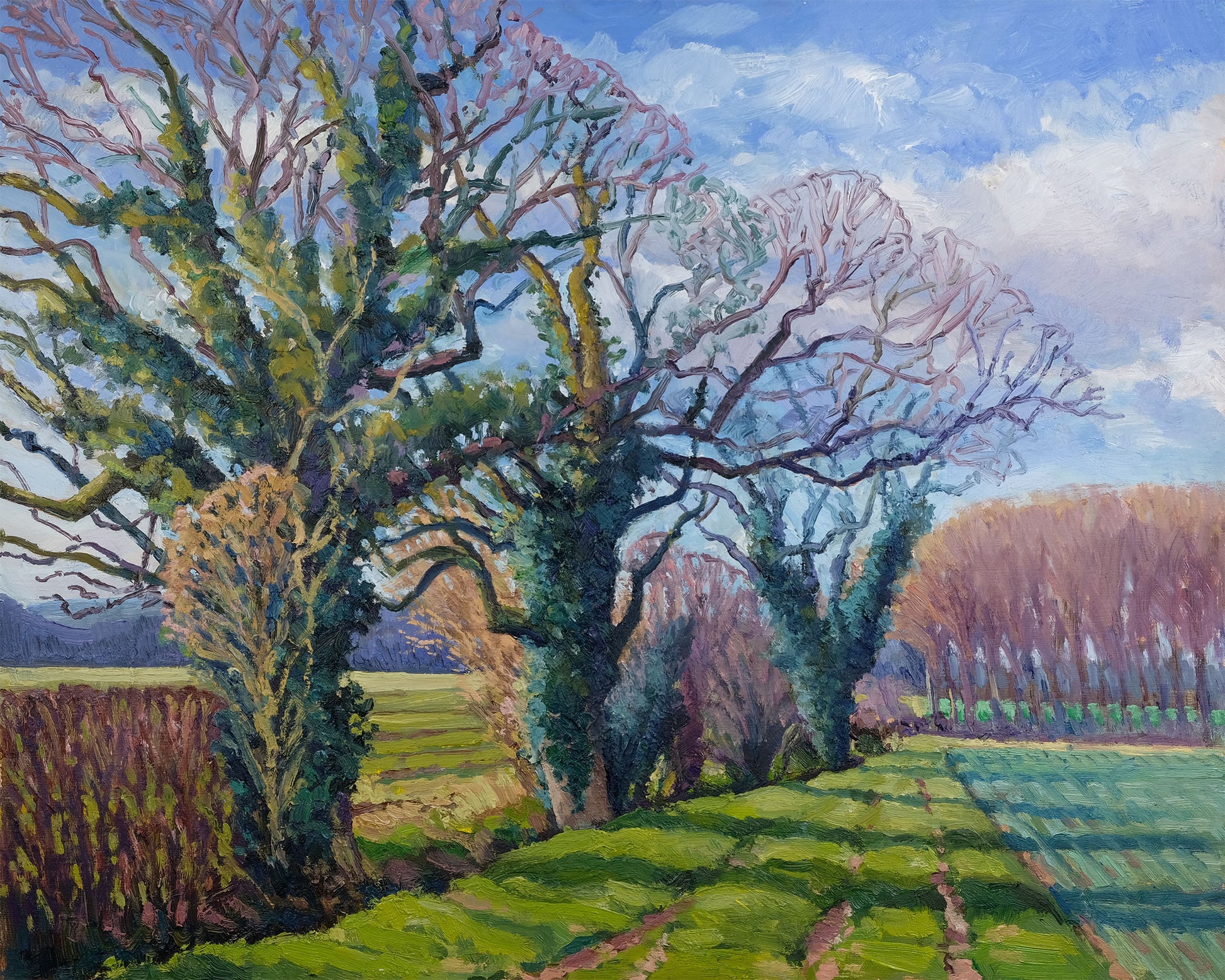 Late March, and there’s a real sense that spring is just around the corner. This view, looking along a small beck winding between arable fields, captures that subtle shift in light as winter loosens its grip and early spring begins to take hold. The painting is built up with textured, expressive brushstrokes, adding depth and a sense of movement to the landscape.