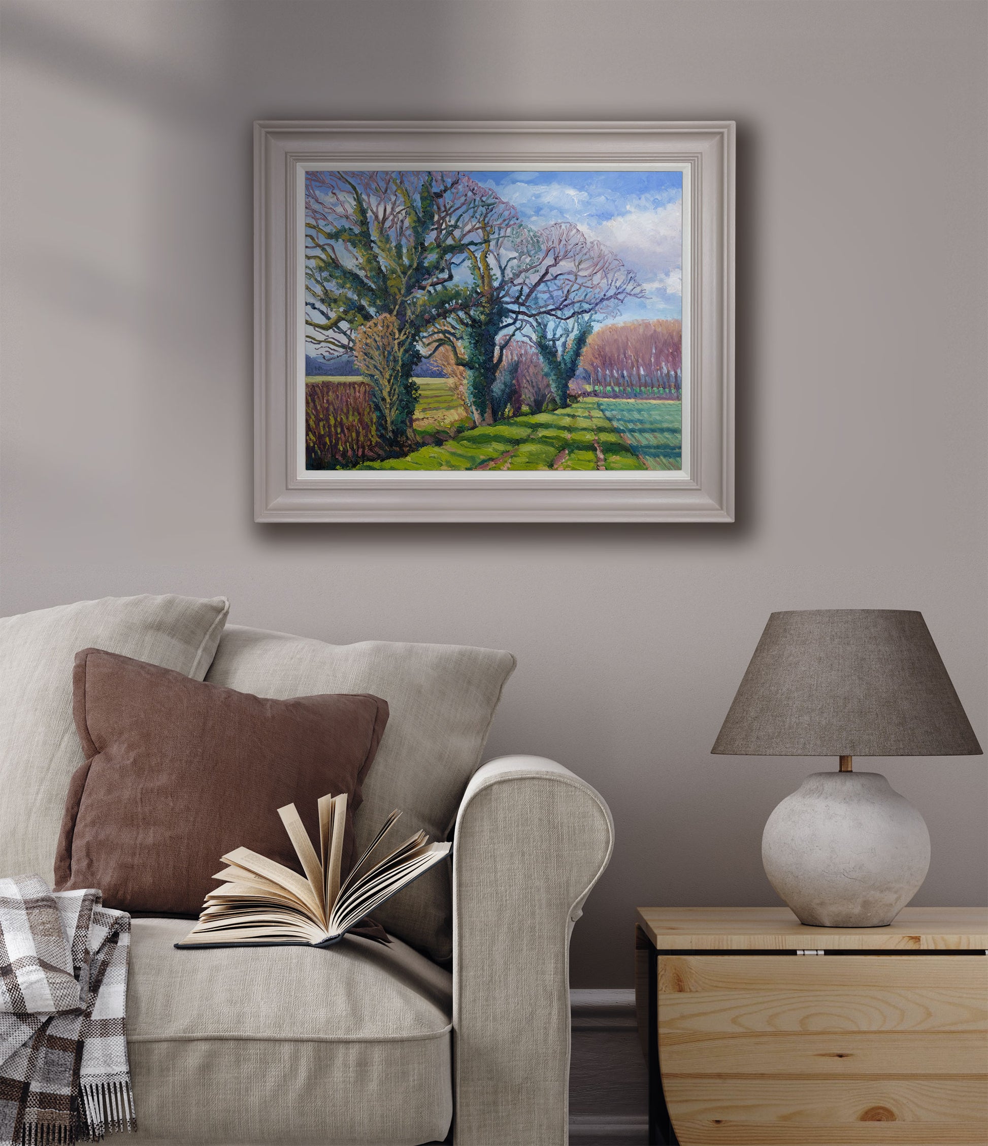 FRAMING is available for this painting in a 50mm wide profile as shown - painted in Farrow & Ball 'Elephant's Breath' with slip in 'Pointing' - please contact me for pricing.