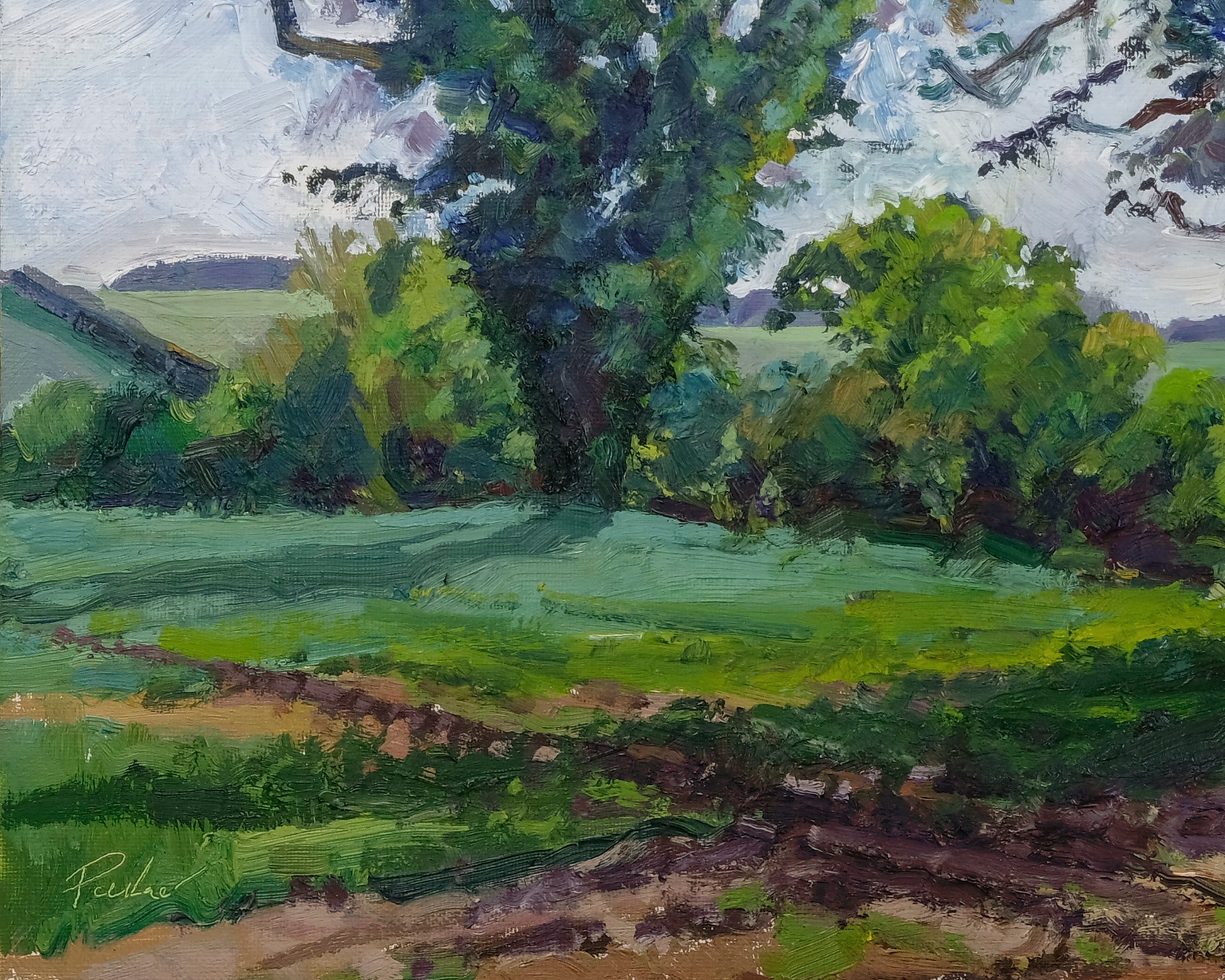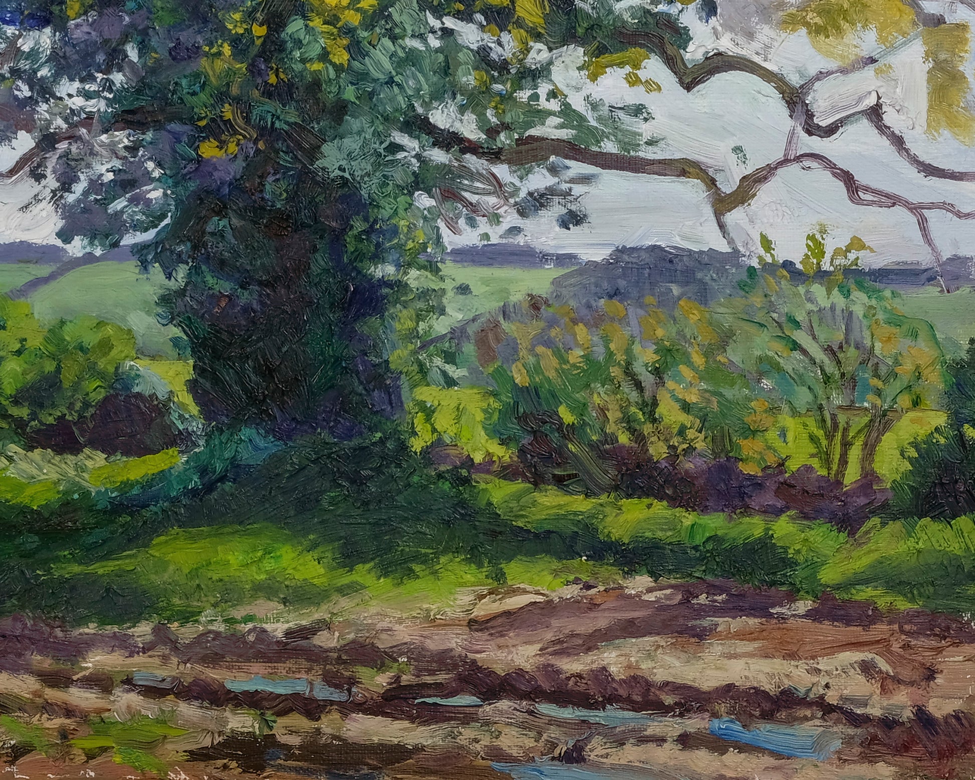 Painted en plein air on a blustery May afternoon this expressive painting captures the beautiful emerging yellow brown foliage of these oak trees which border a ploughed field near the small village of Coxwold in North Yorkshire. The real variety of greens, warm and cool and their relationship to each other really caught my eye and the sodden mud tracks added a great compositional quality. The paint is applied thickly with expressive and gestural brushstrokes.