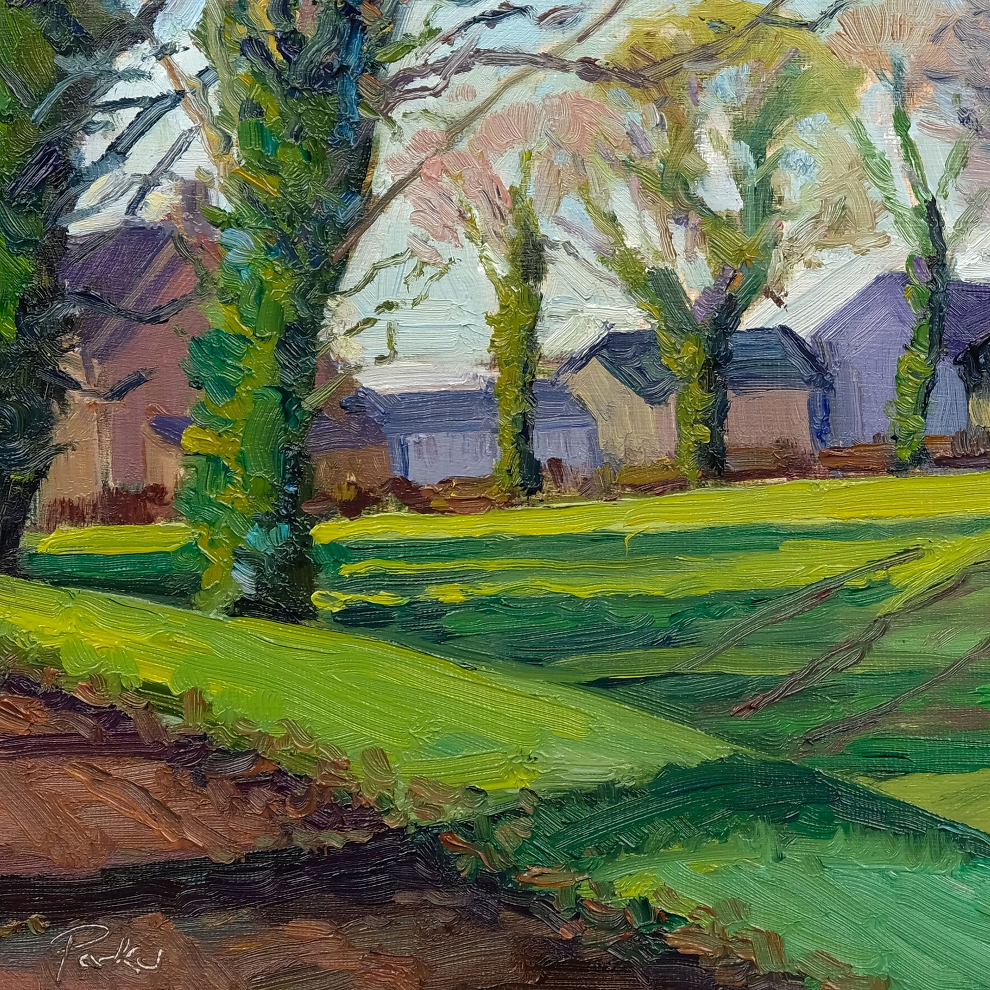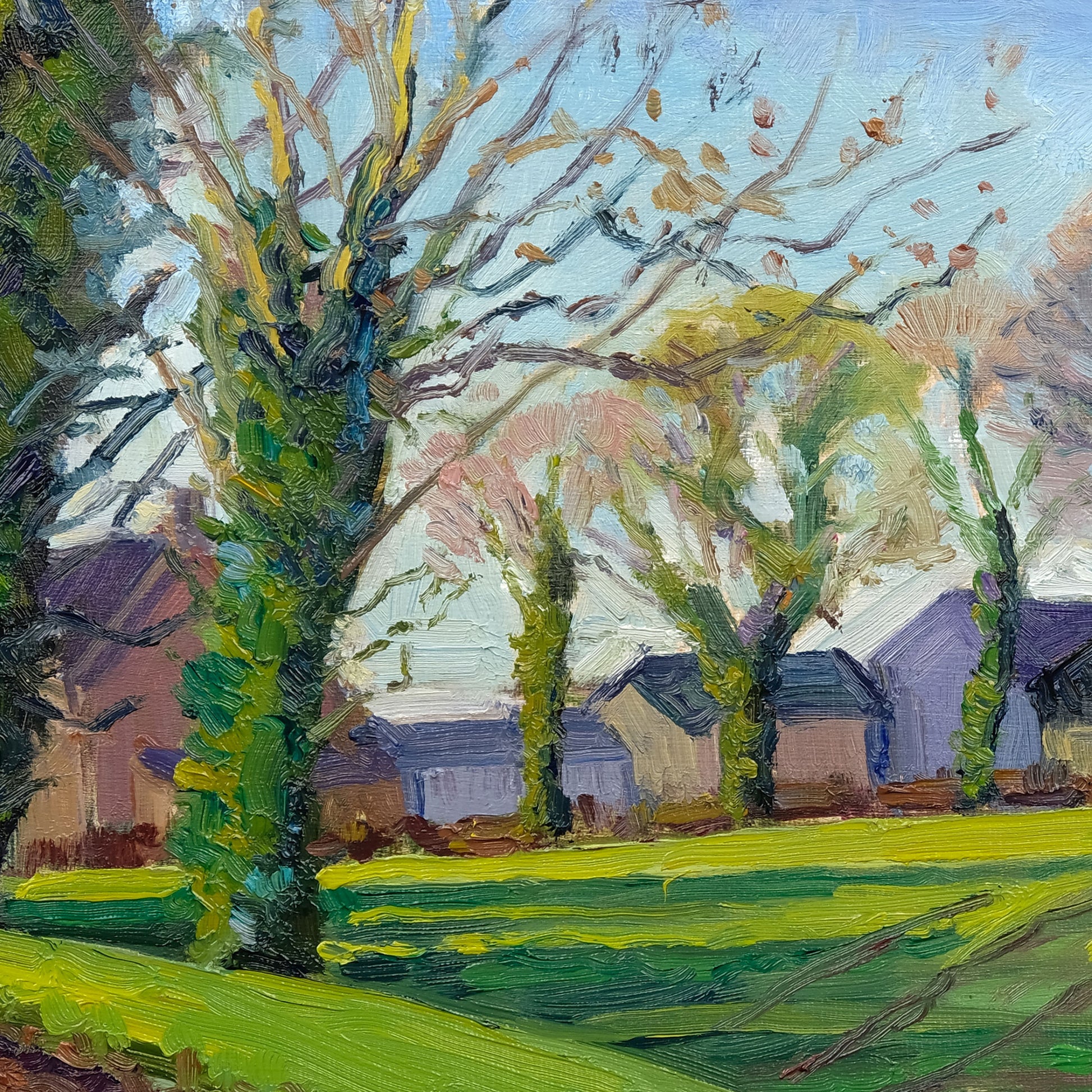 Painted on location in early January, this view looks towards Peep o’ Day Farm on Thornton Hill. Low winter light moves across the land, catching the hedgerows and lifting them against the cooler tones of the fields and distant ground. The track draws the eye forward through the composition, while subtle shifts in colour reflect the quiet clarity of the season. A study of winter light, structure and distance.