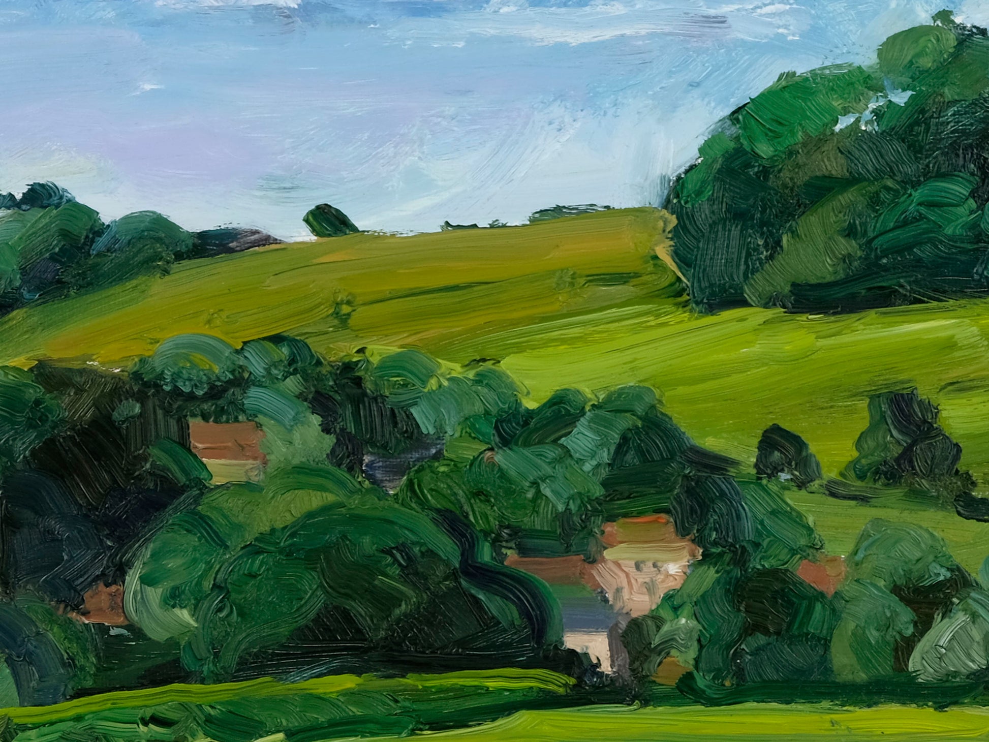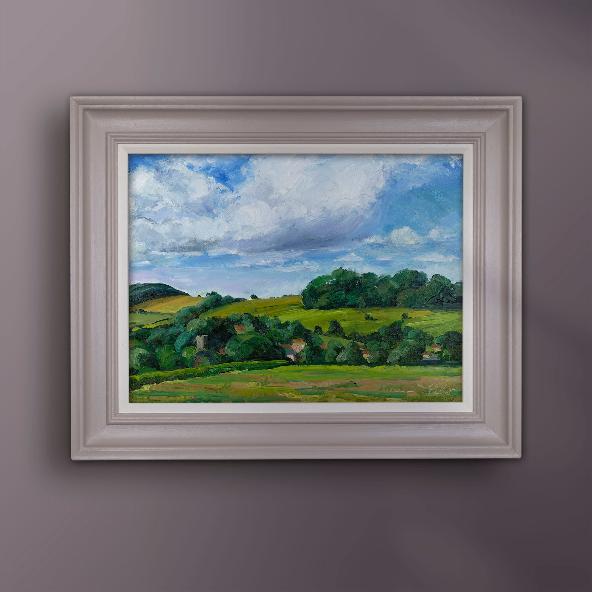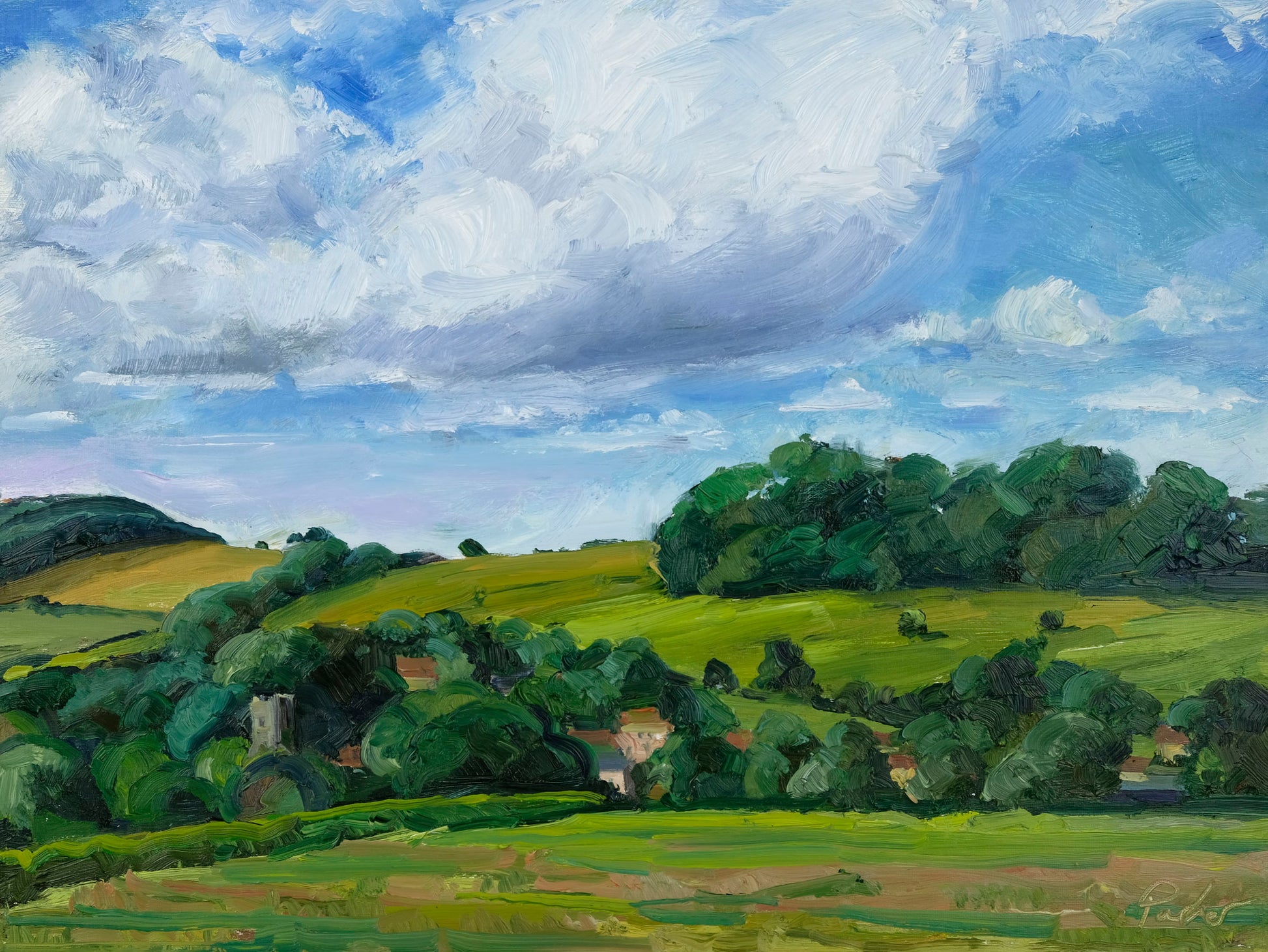 This painting captures a view towards a small village in the Howardian Hills, renowned for its 8th-century church, Stonegrave Minster. The church tower can be glimpsed among the trees in the lower left of the picture. Painted en plein air on a hot July afternoon, this scene showcases the serene beauty of this countryside which is designated an Area of Outstanding Natural Beauty.