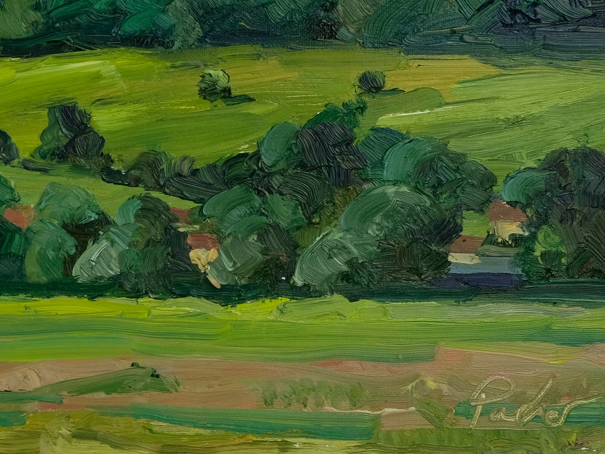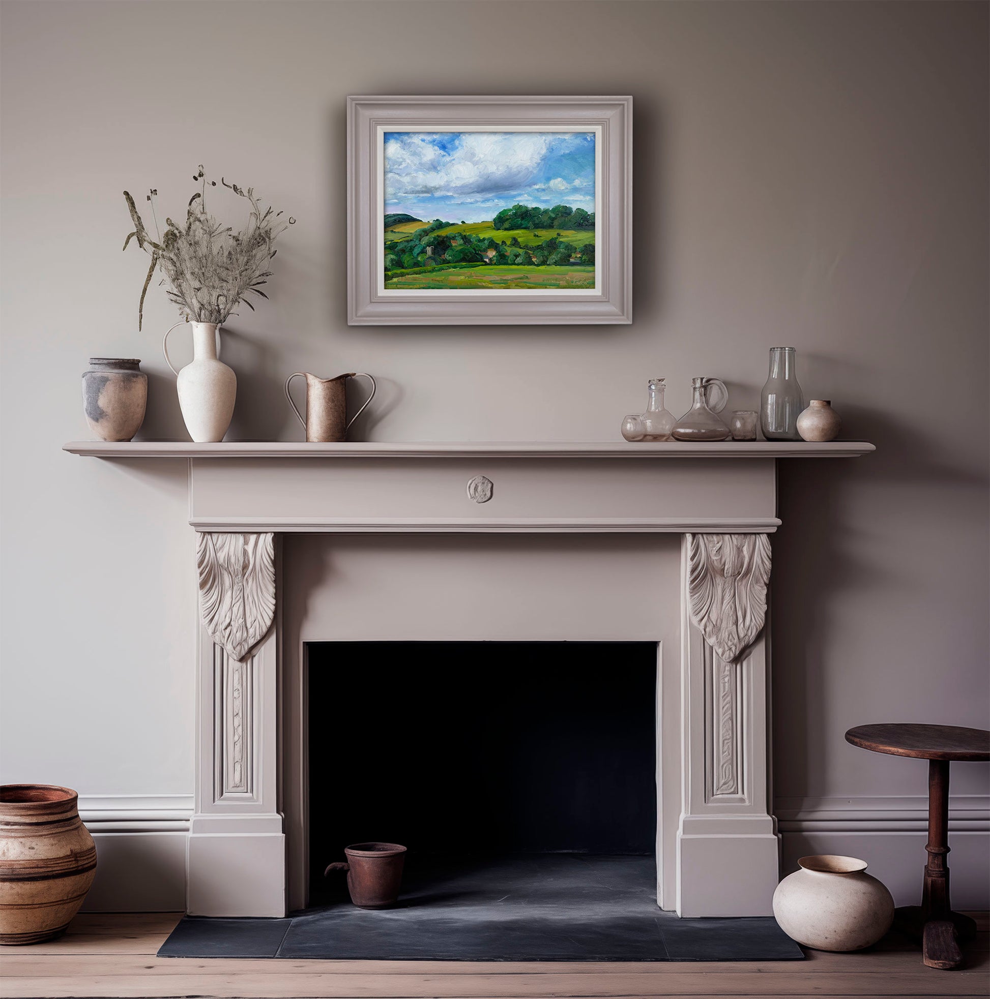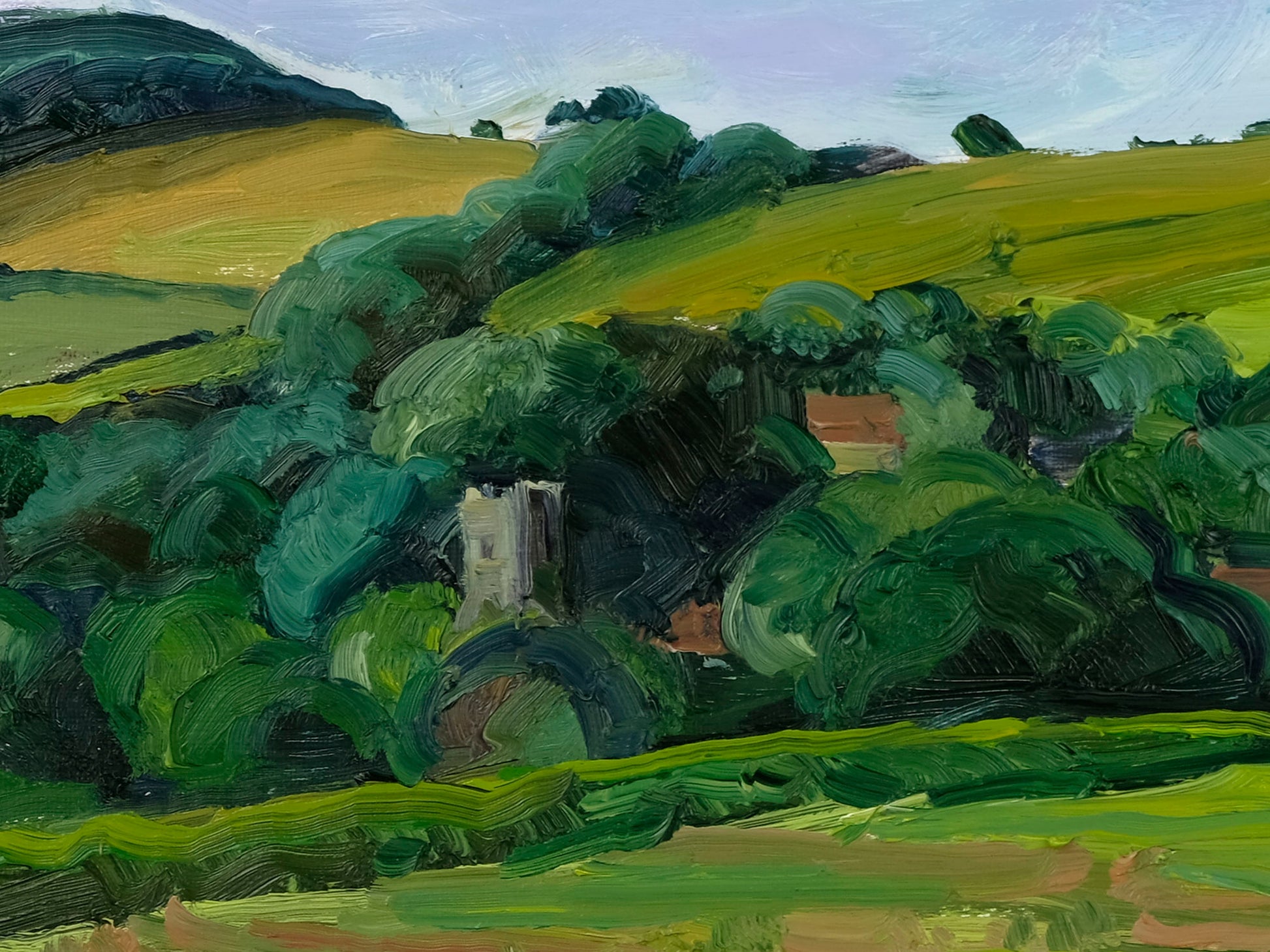 This painting captures a view towards a small village in the Howardian Hills, renowned for its 8th-century church, Stonegrave Minster. The church tower can be glimpsed among the trees in the lower left of the picture. Painted en plein air on a hot July afternoon, this scene showcases the serene beauty of this countryside which is designated an Area of Outstanding Natural Beauty.
