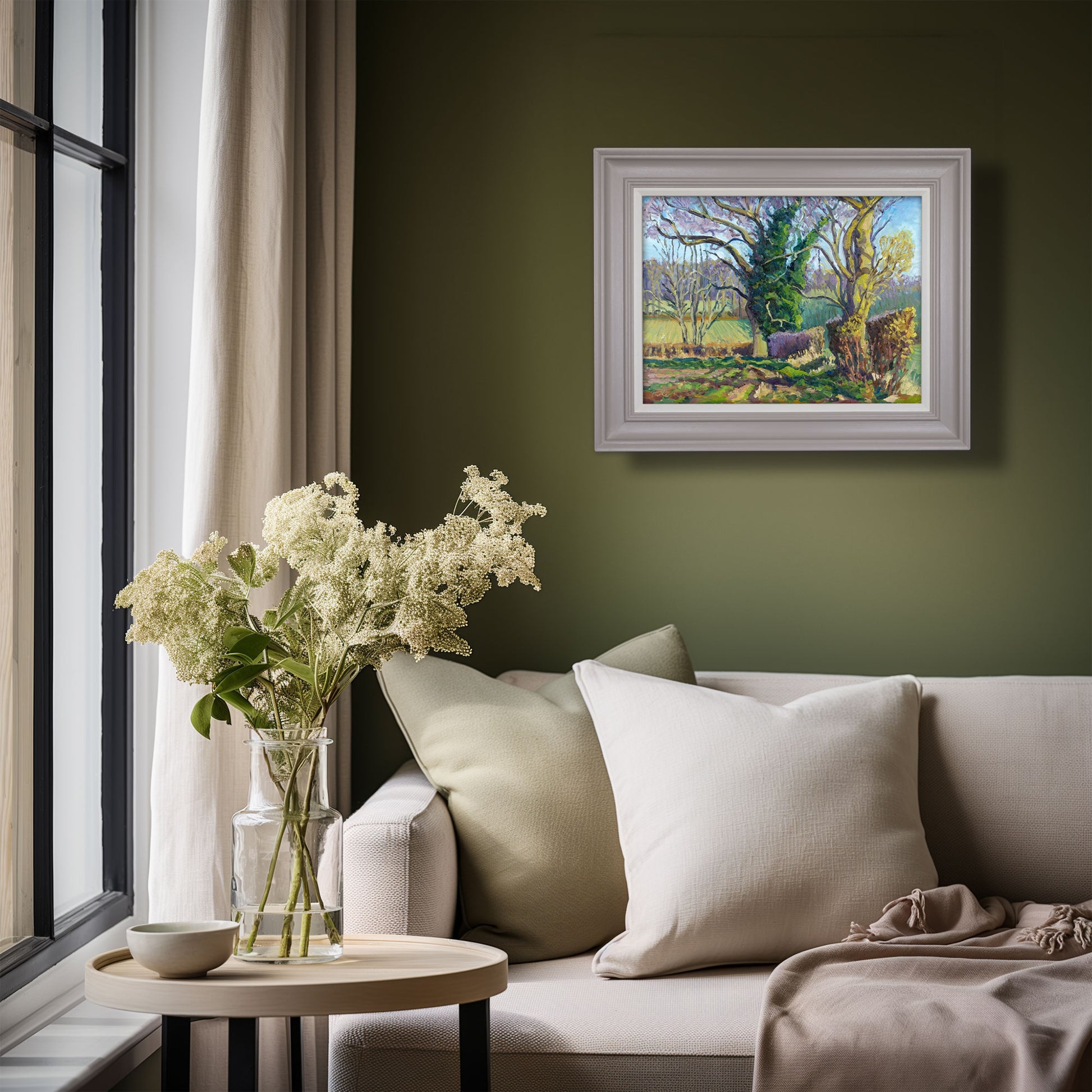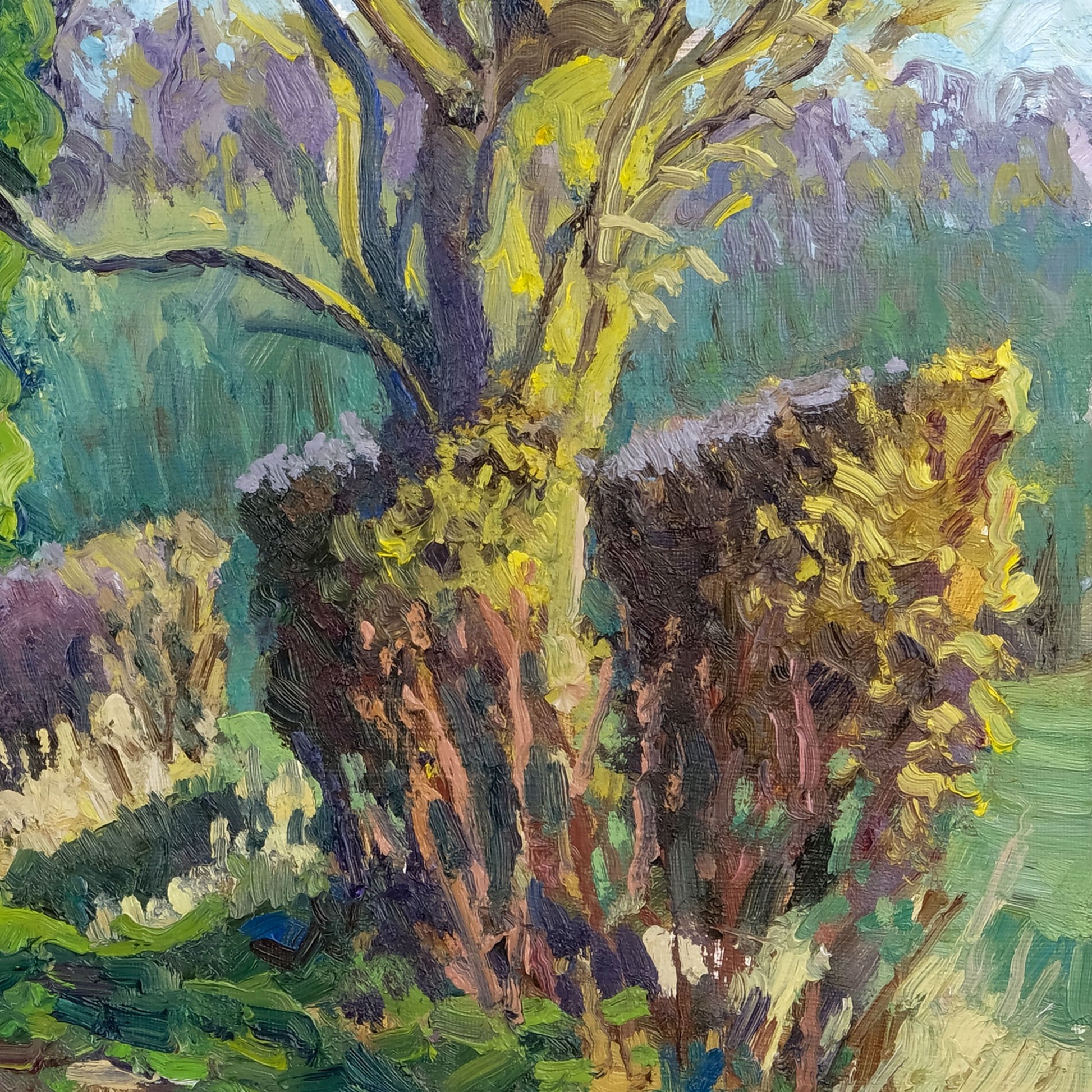 Painted en plein air on a bright February day, this piece captures the subtle but rich colours of winter. The bare trees and hedgerows stand out against the clear sky, with the winter light bringing out the ochres, greens, and violets in the landscape. The expressive brushwork reflects the crisp stillness of the season, highlighting the quiet beauty and stillness of the landscape as we slowly move towards Spring.