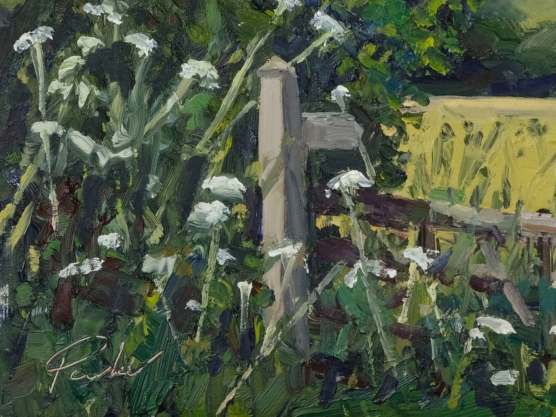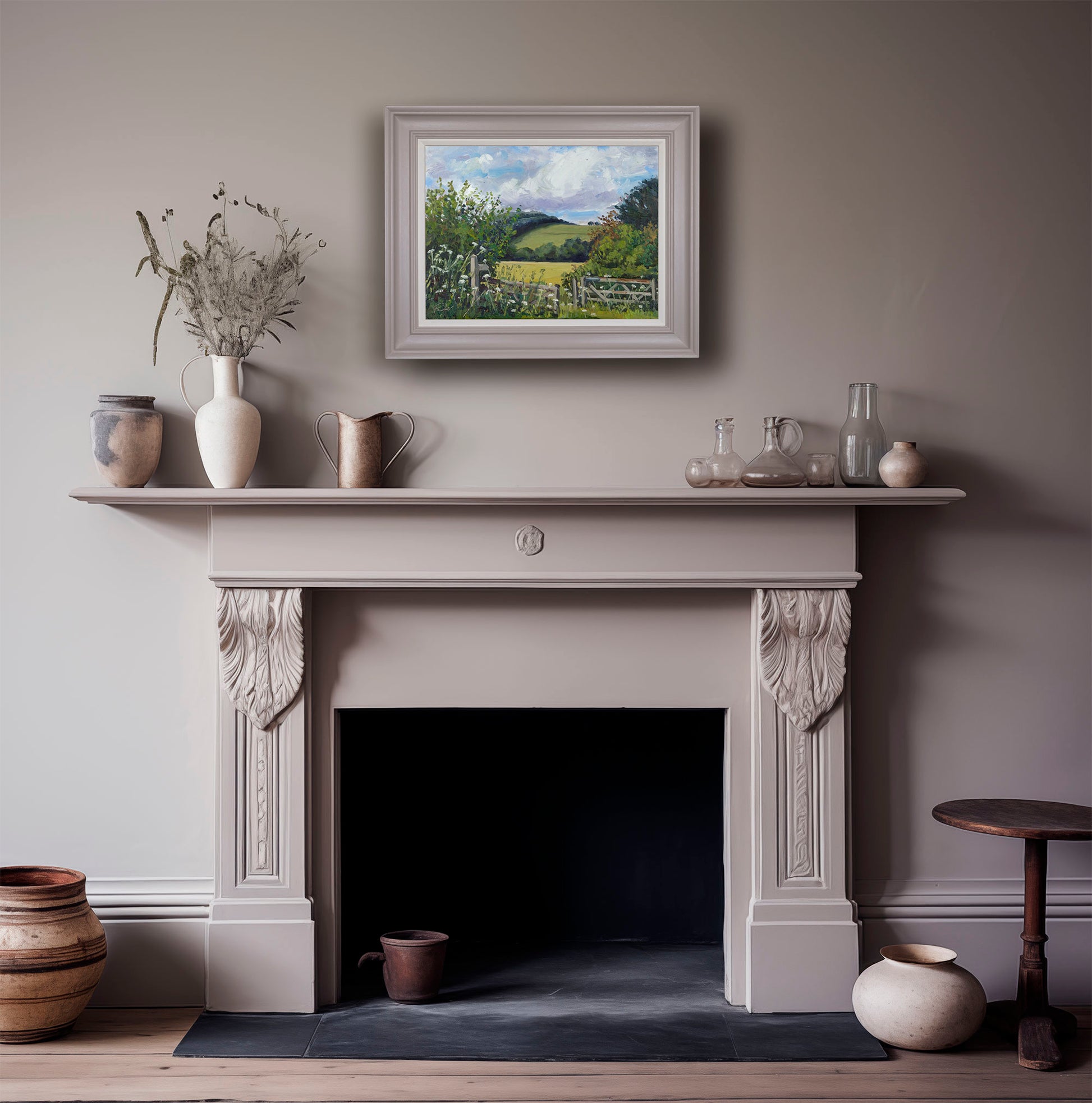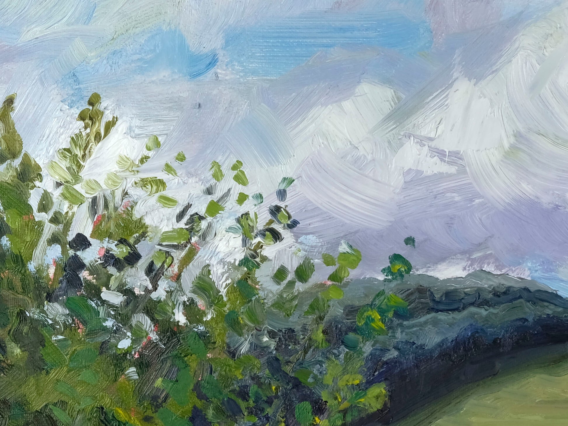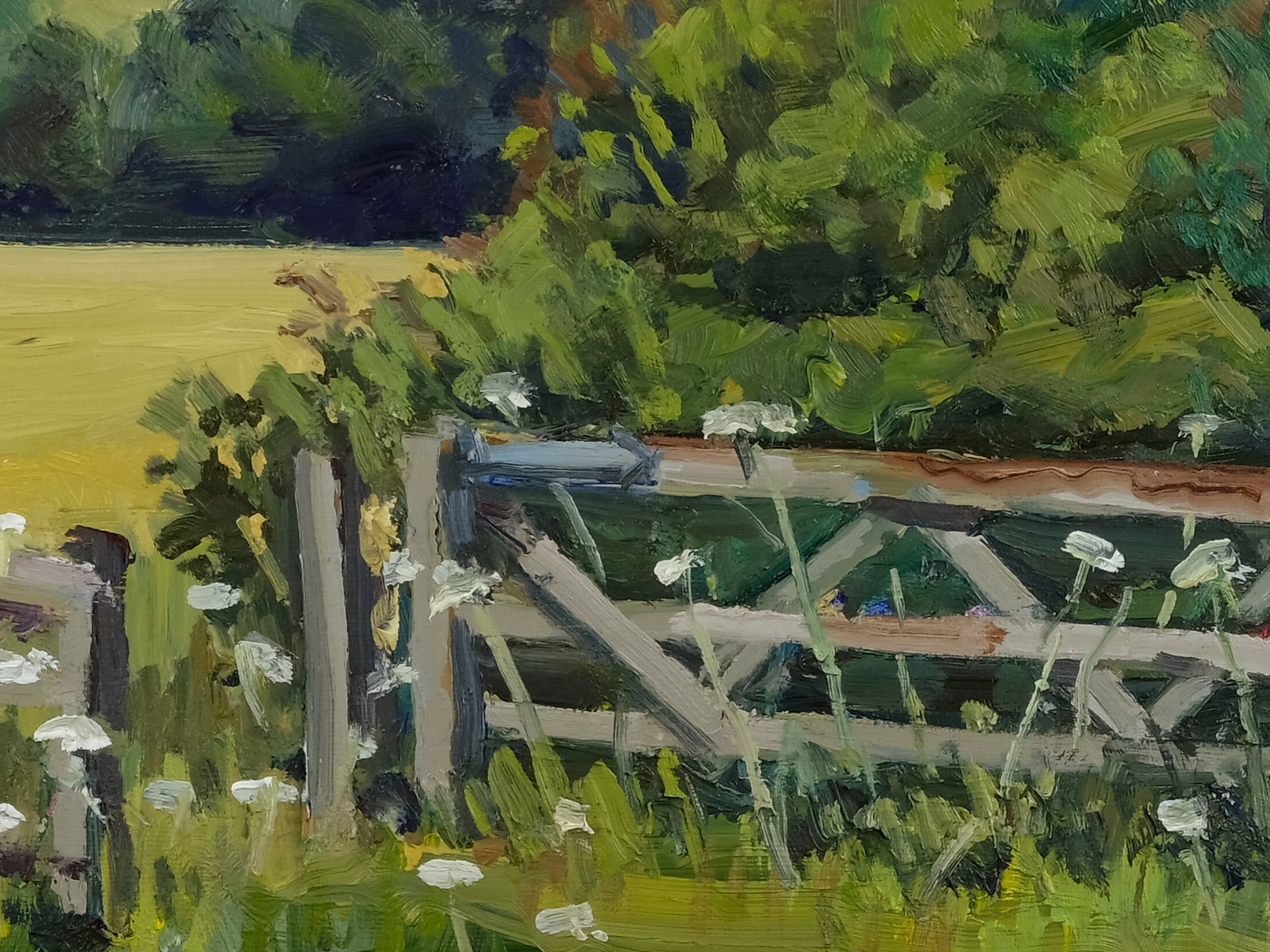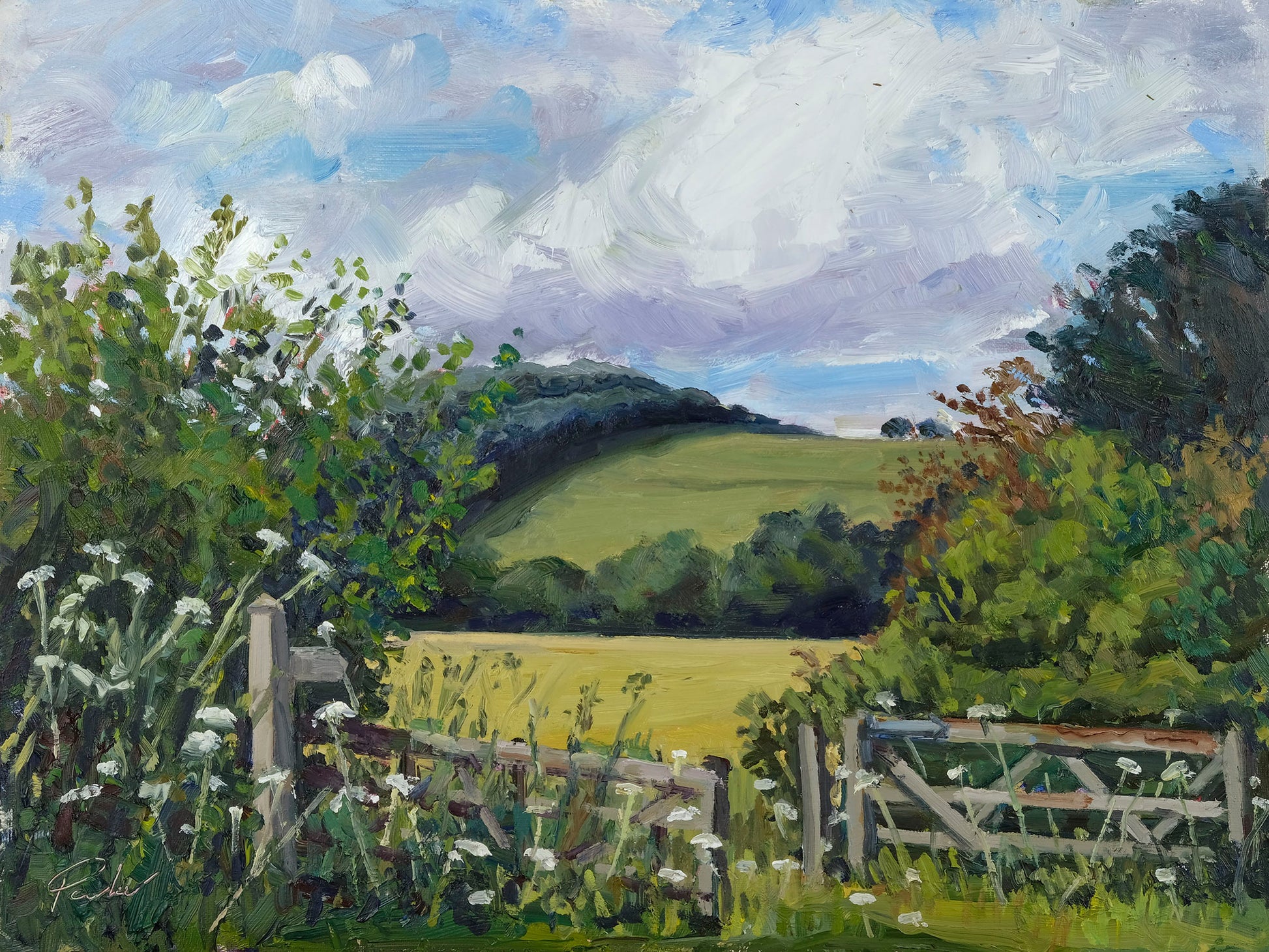I often revisit favourite locations throughout the seasons, finding that some scenes shine best in winter, while others are at their peak in spring or summer. This painting captures a view towards 'Scarlet Wood' near Stonegrave. It was a beautiful July day in North Yorkshire, with billowing clouds drifting across the sky, wheat fields ripening, and cow parsley surrounding an open gate.