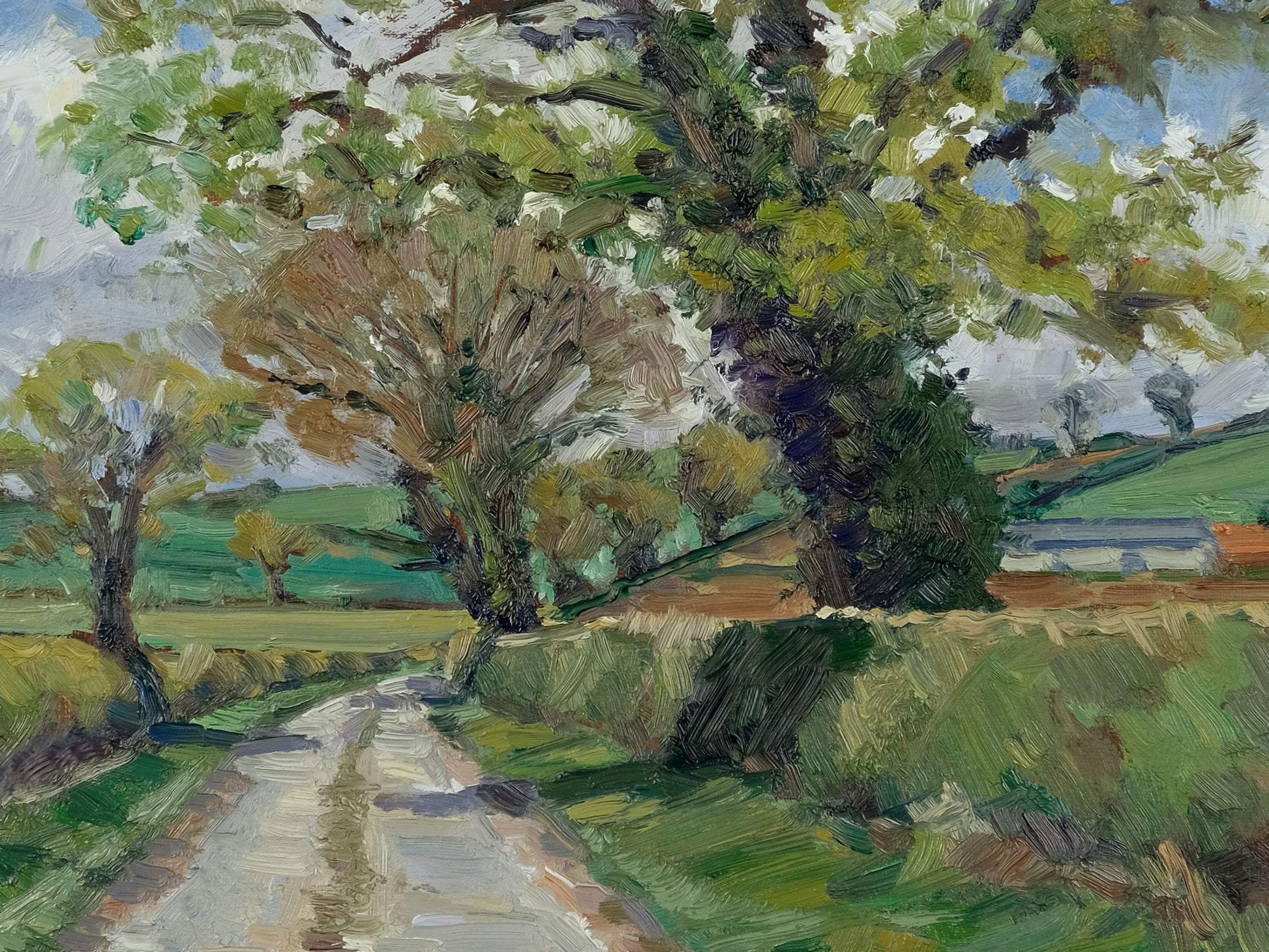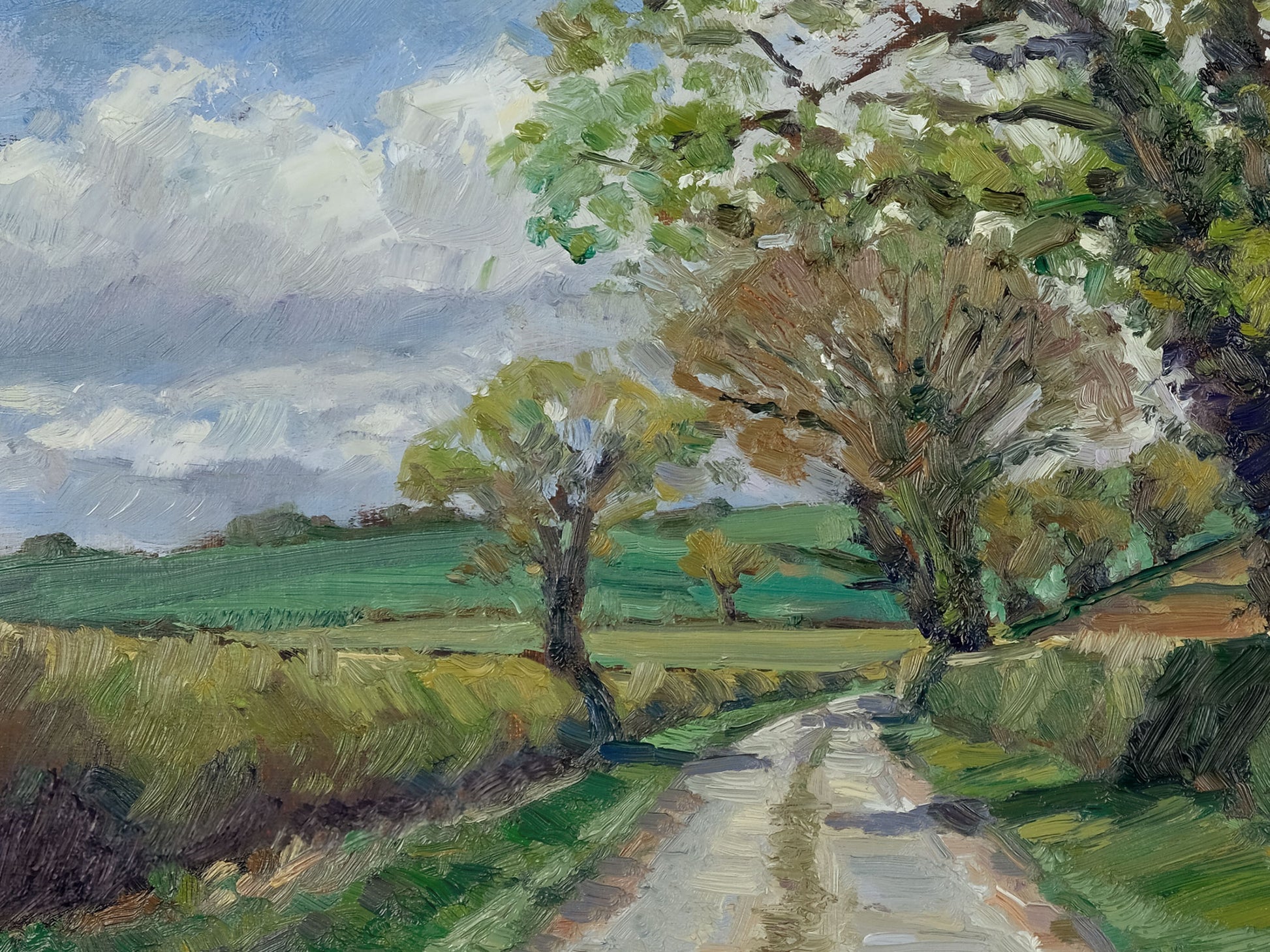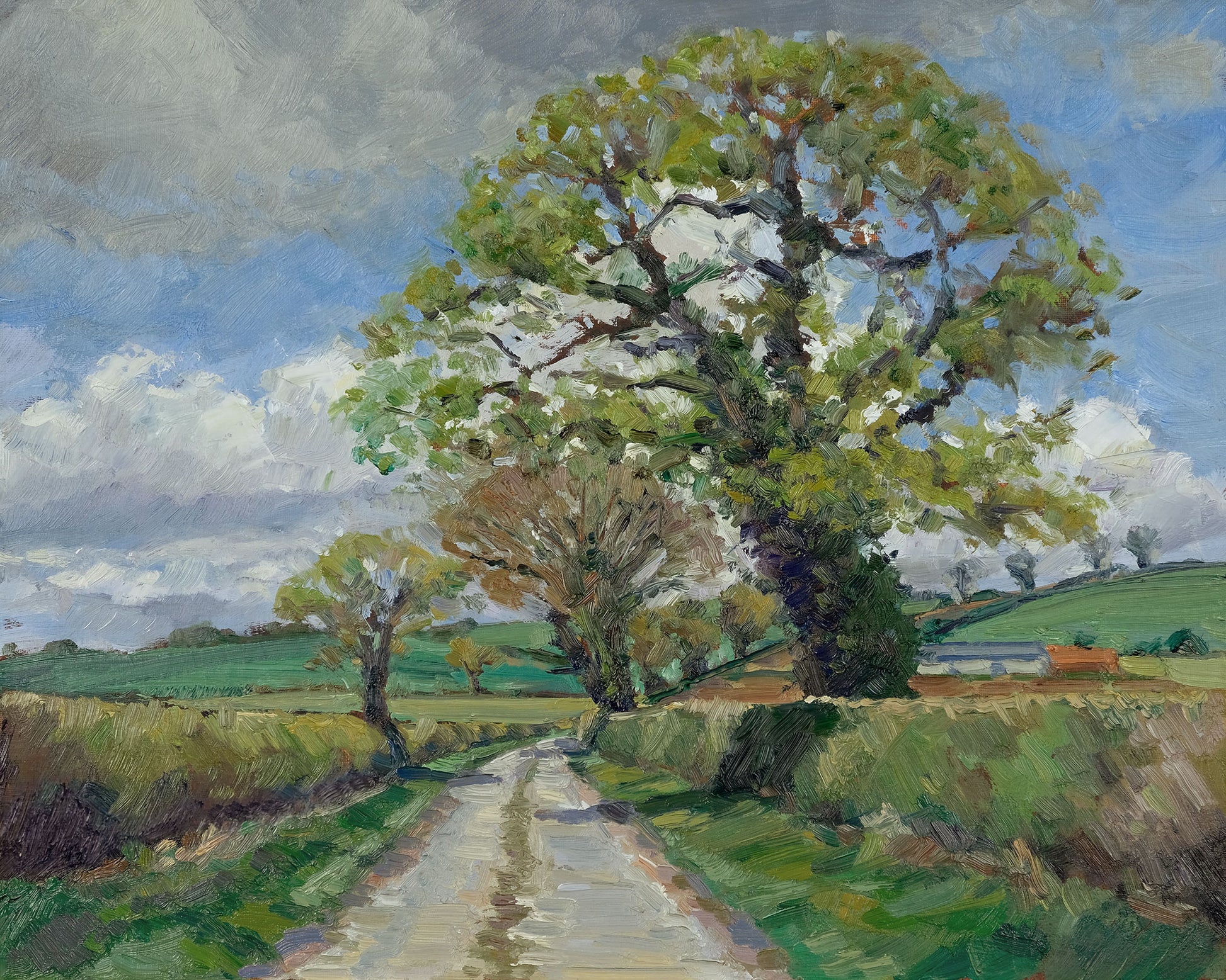 Painted on location in early spring, this view looks along a quiet lane as the season begins to shift. The first signs of growth are just starting to show in the trees, with fresh greens lifting through the hedgerow and soft light moving across the fields.