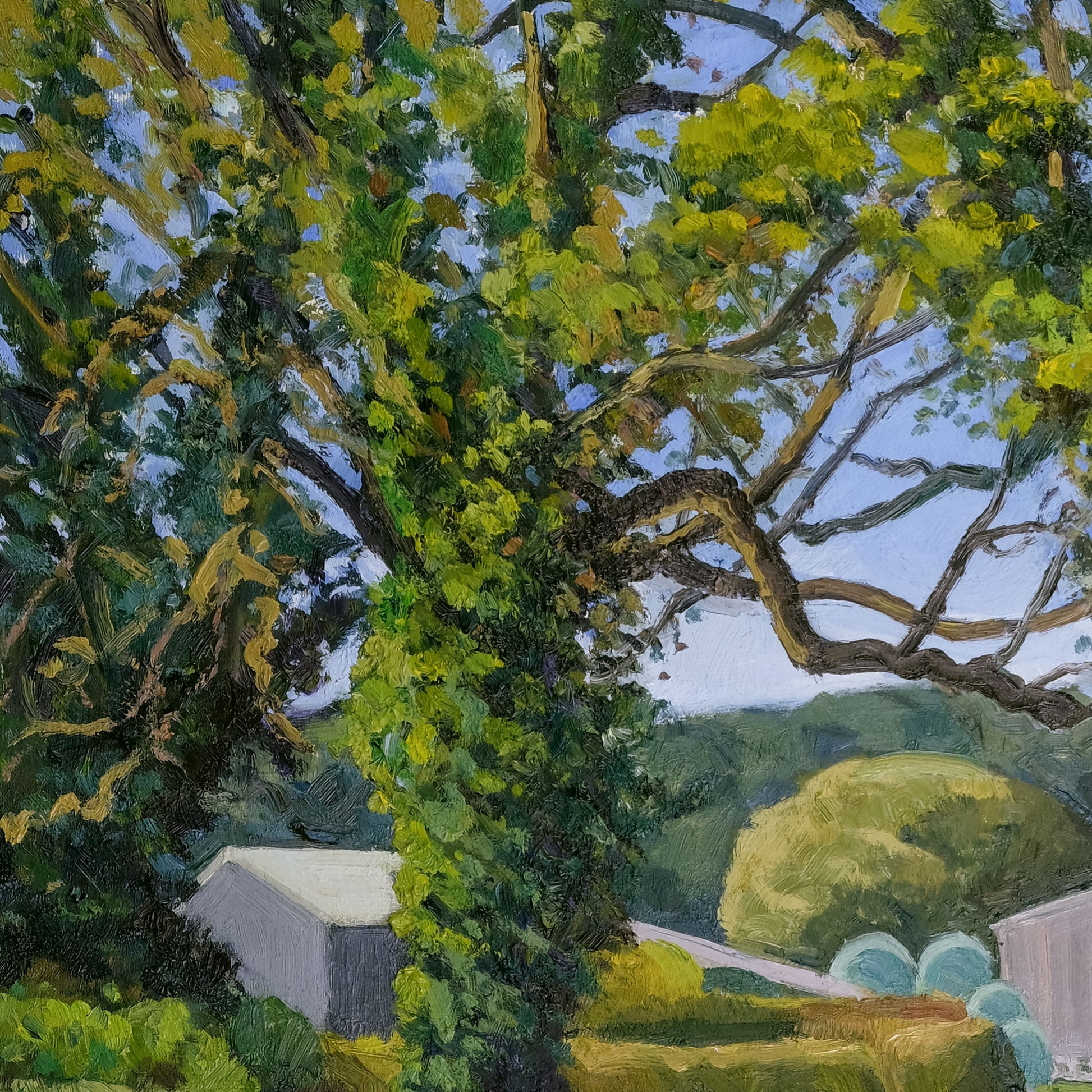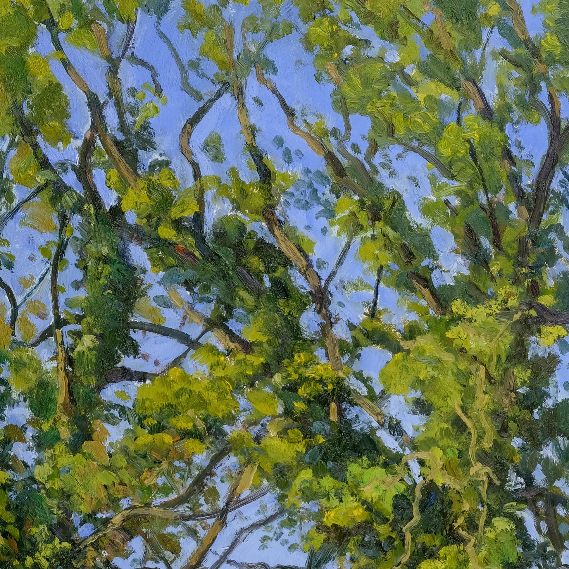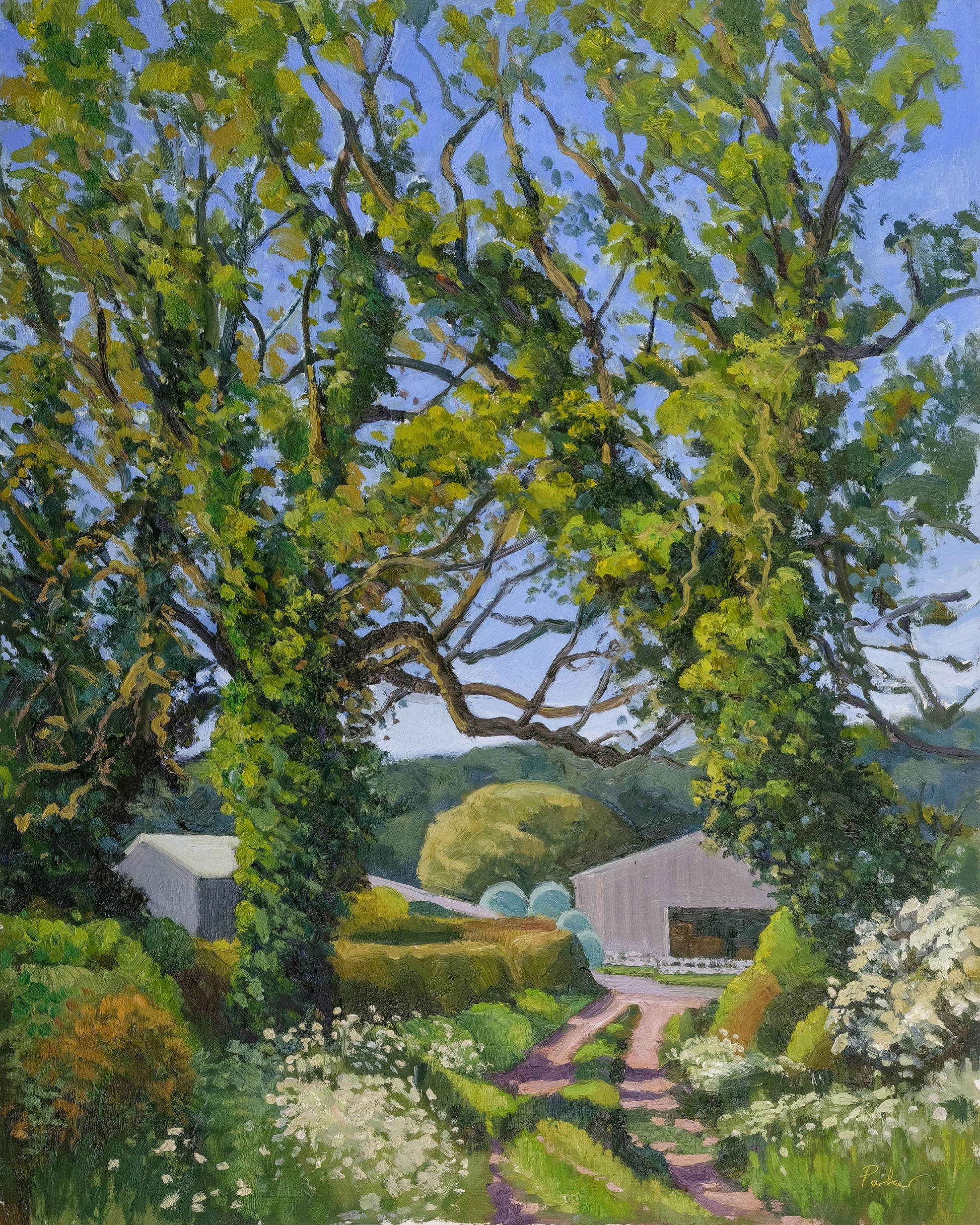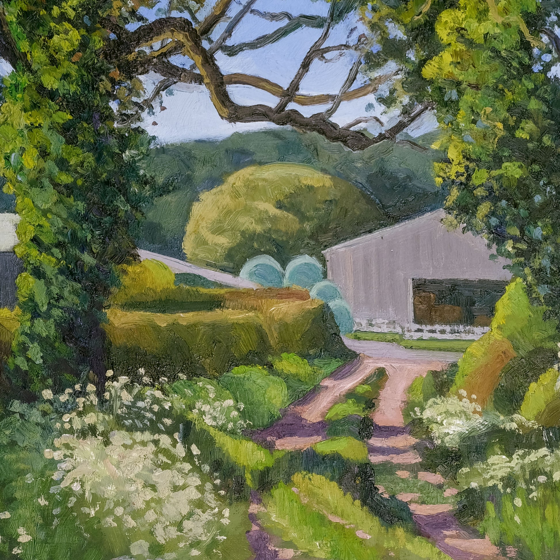 A hot sunny day in mid May with beautiful light and a real mix of greens in the foliage and hedgerows as well as plenty of hawthorn and cow parsley. This quiet track is a constant source of inspiration throughout the year, covered by these two wonderful mature trees.