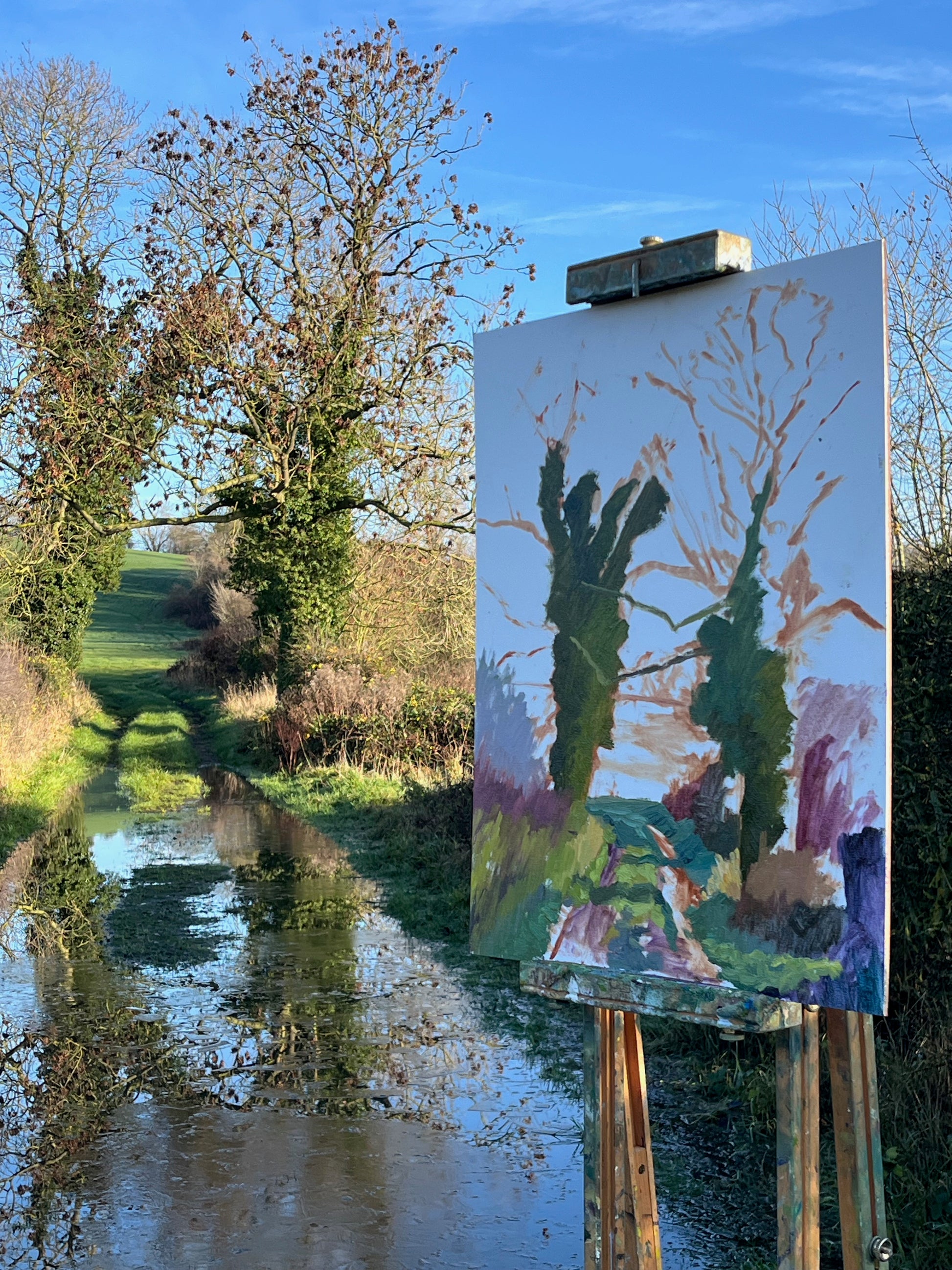 Painted on location near Kilburn on a still mid-December day, this piece captures one of my most familiar and revisited views. After weeks of rain, the track had become a stream, I painted this standing ankle-deep in a puddle, which you can just see reflected at the bottom of the painting. I’m always drawn to the sculptural forms of these twin trees in winter; their bare branches and moss-covered trunks seem to hold the memory of many seasons.