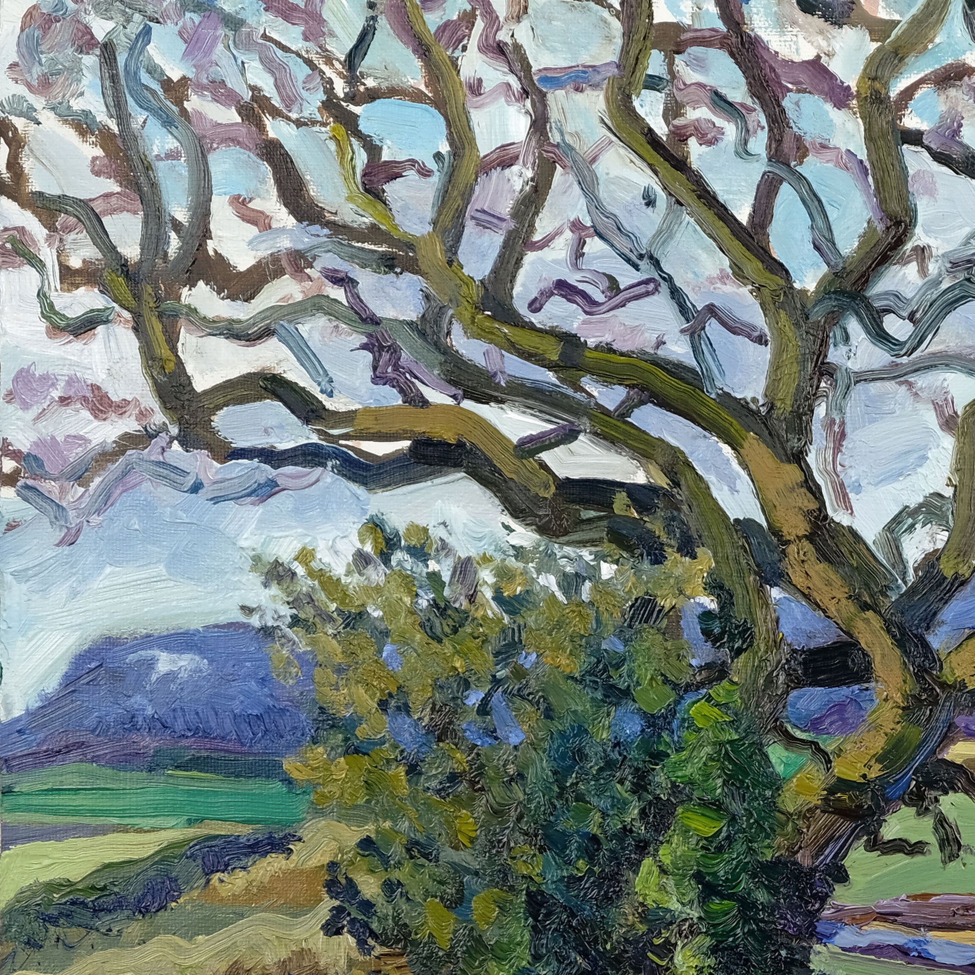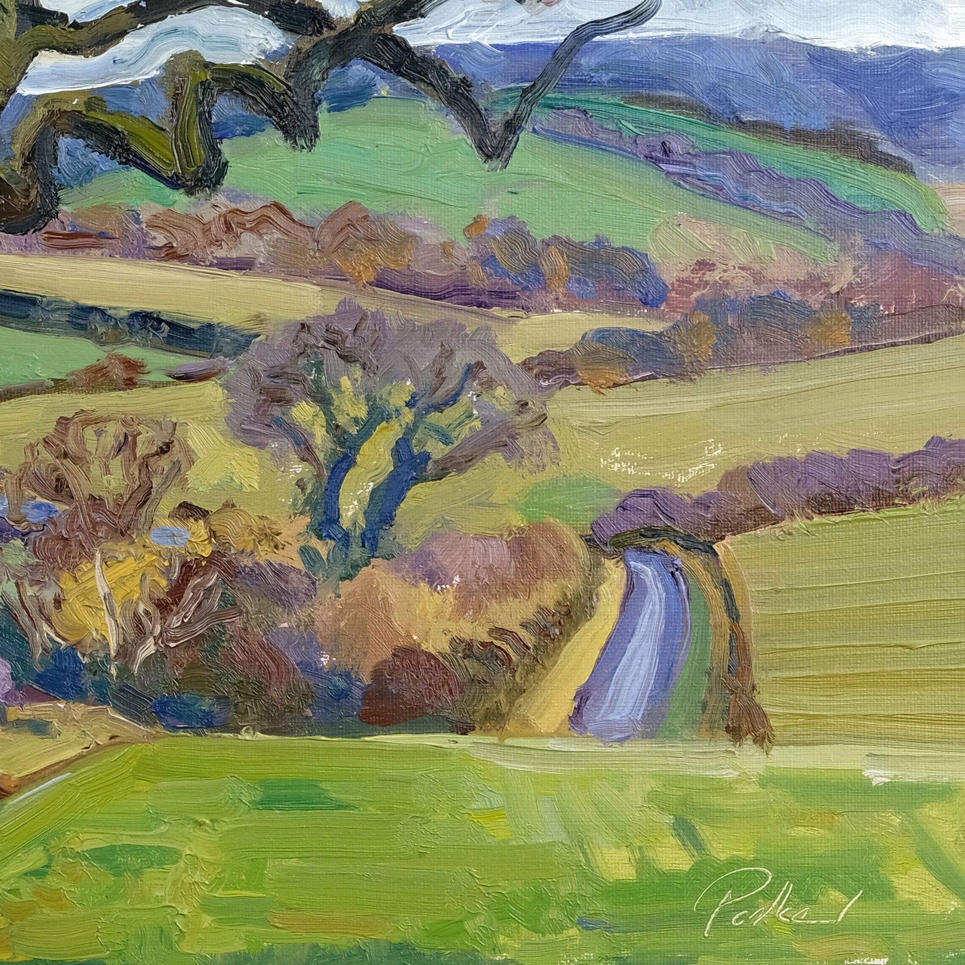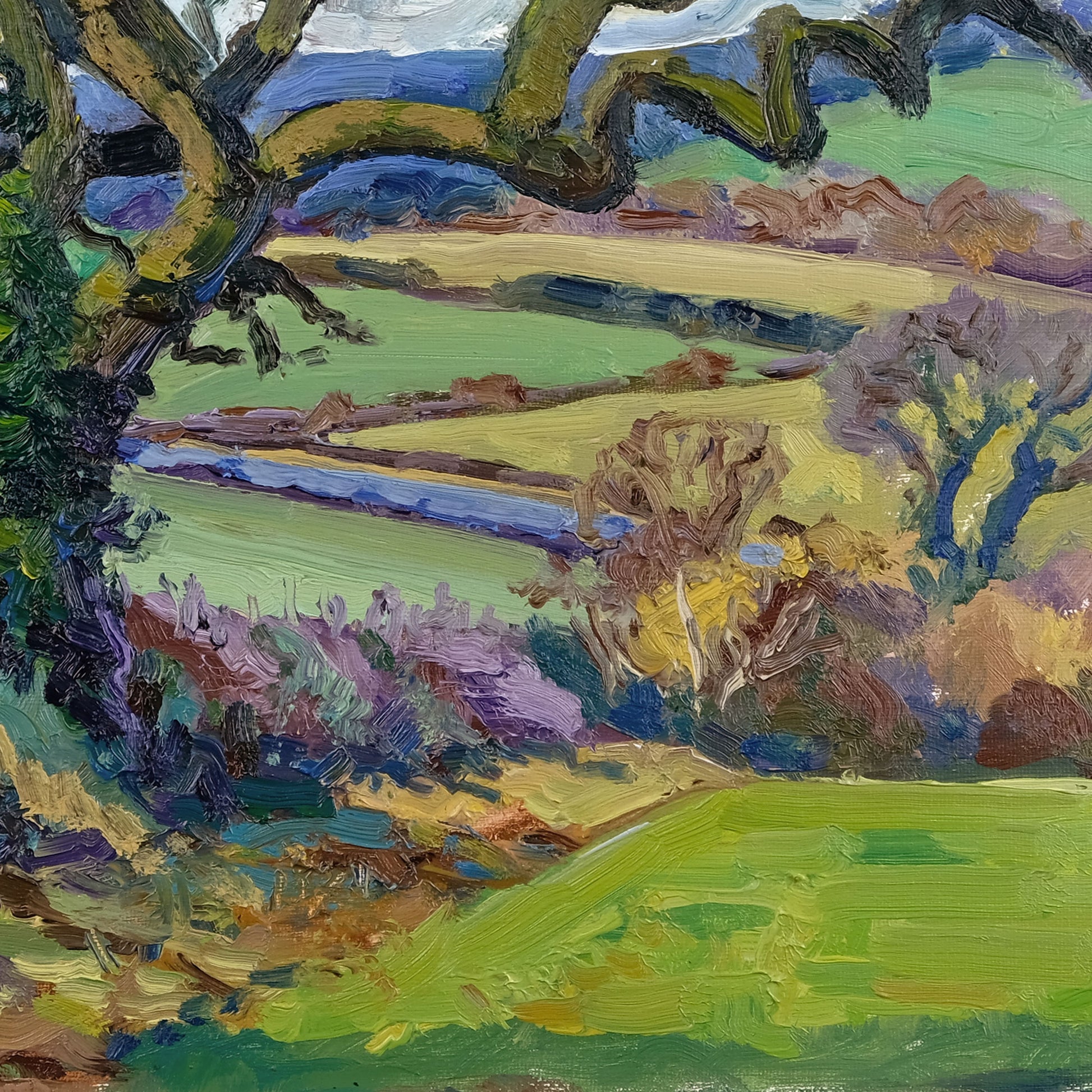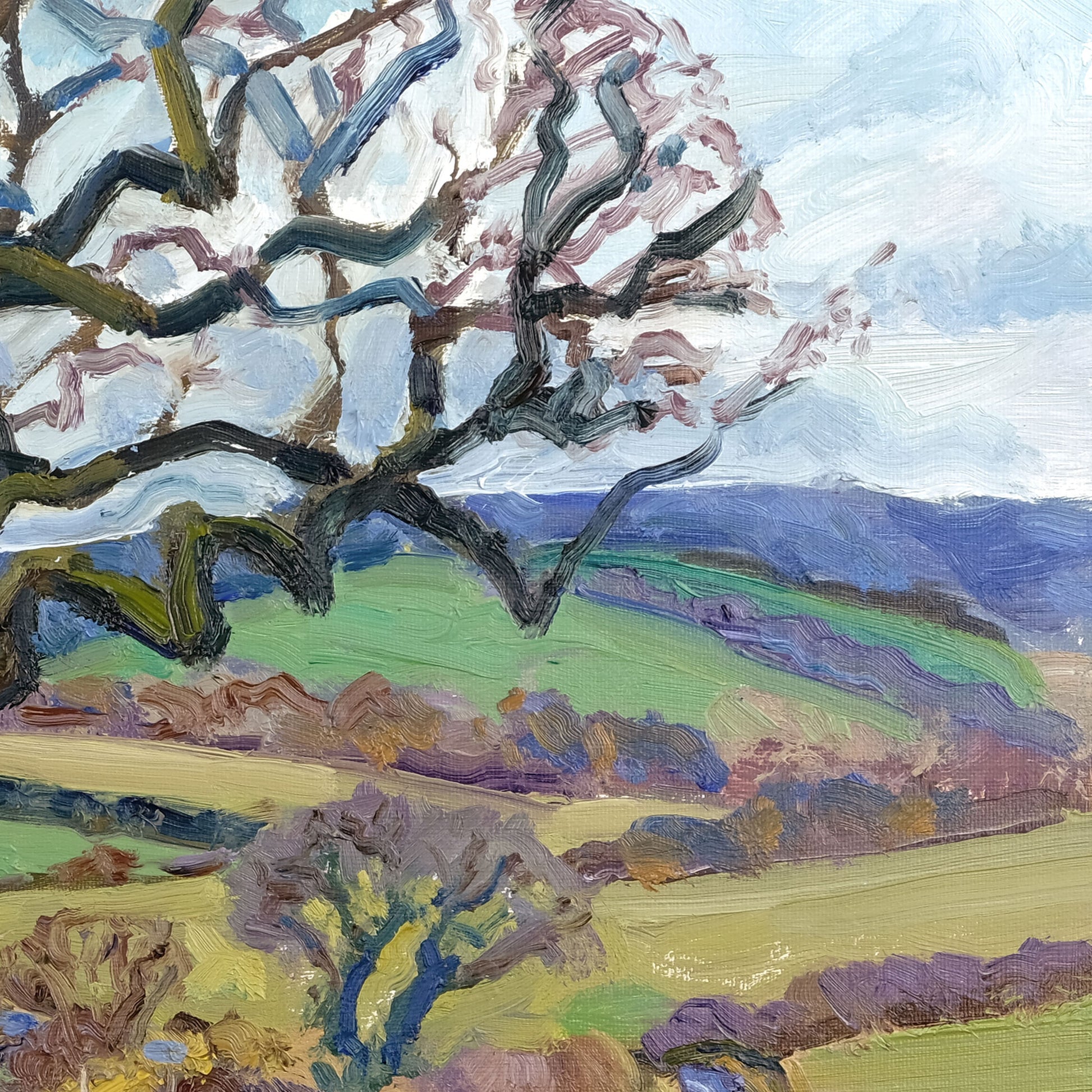 Painted entirely on location, this painting captures the quiet stillness of a late January day in the North Yorkshire countryside. With bold, expressive impasto brushwork, the piece conveys the crisp clarity of the season, where the ochres, burnt sienna, and violets of the bare shrubbery contrast against the cool, subdued tones of the winter landscape in its quietest moments.
