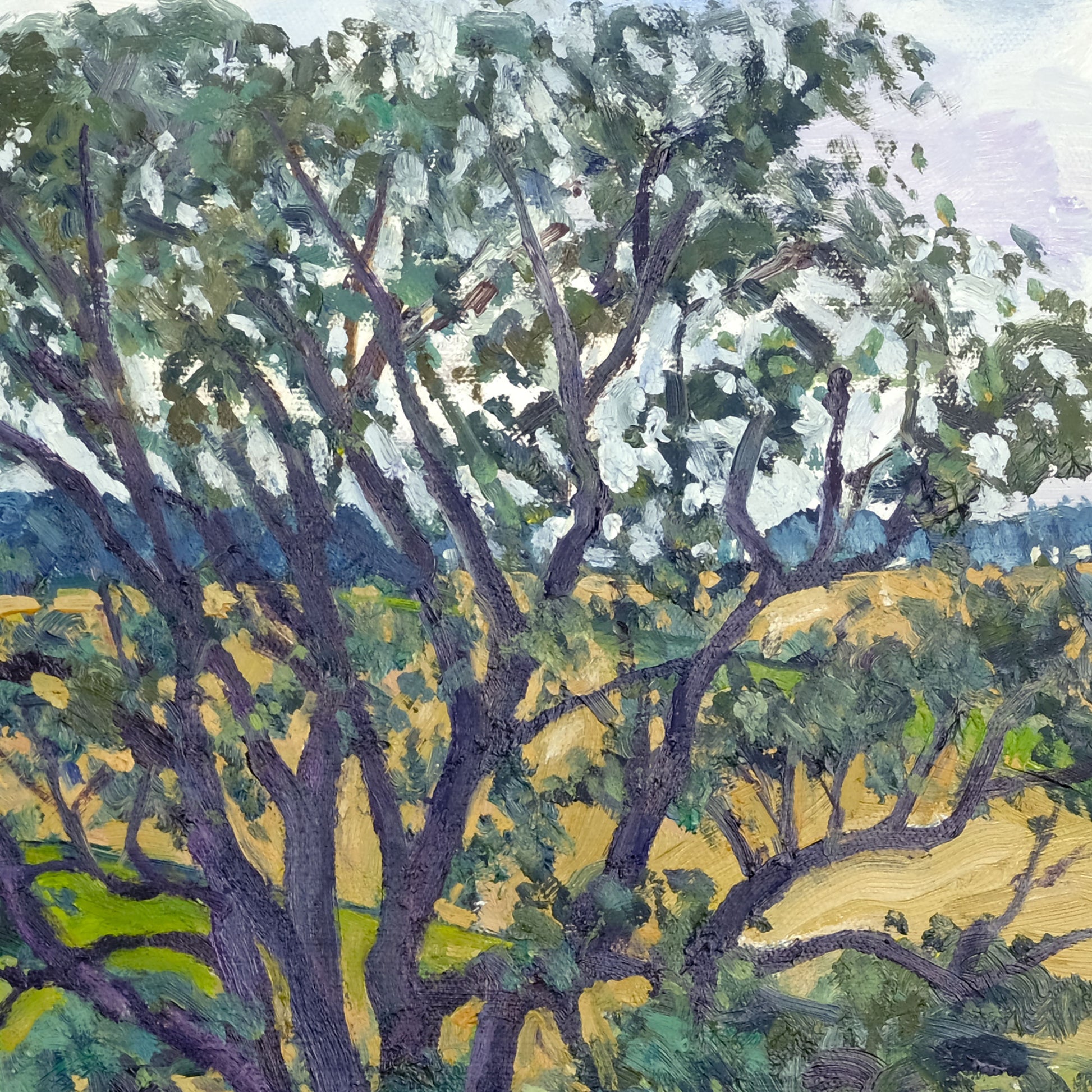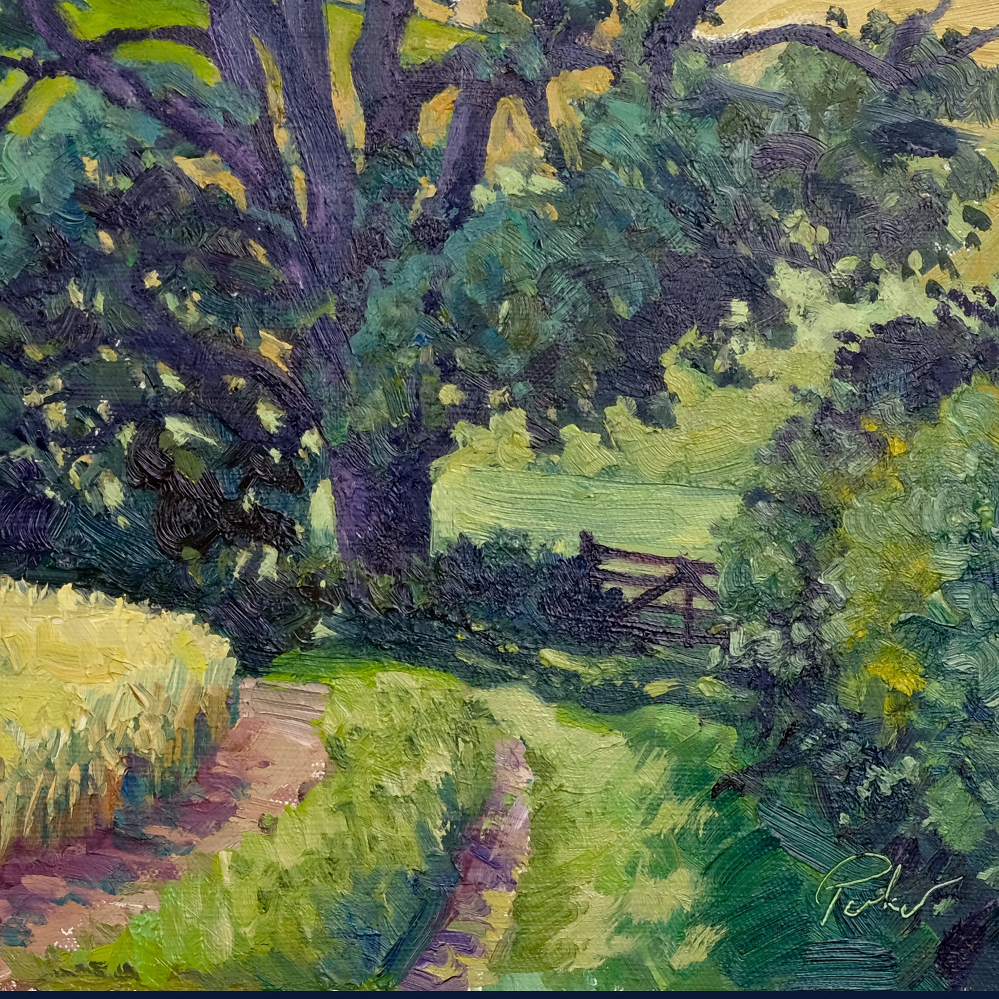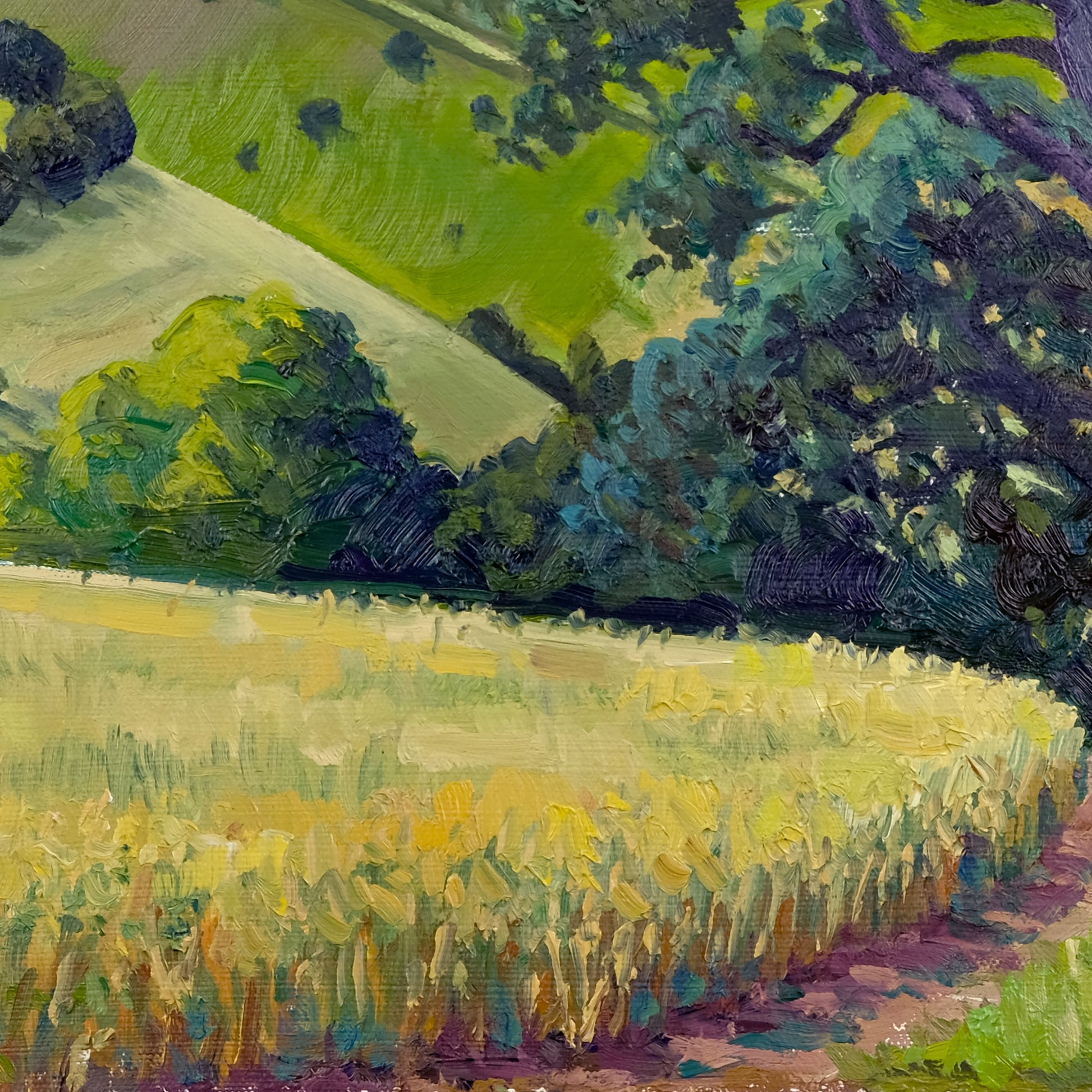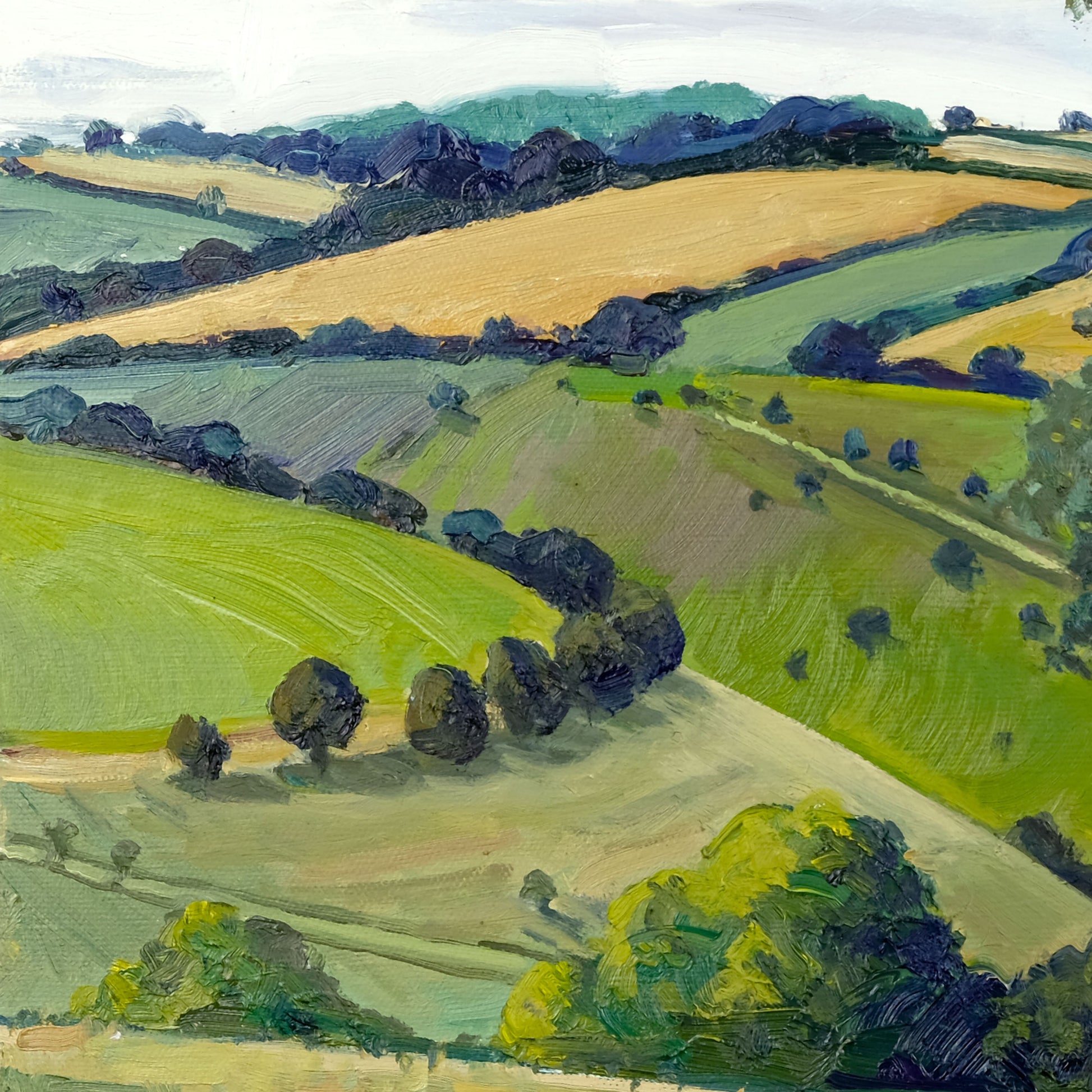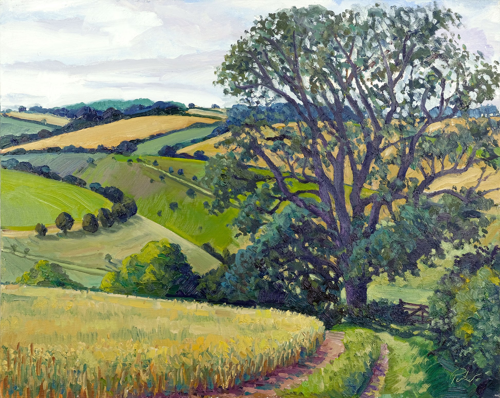 Painted in the golden light of late summer, this view of the Yorkshire Wolds near Thixendale captures the serene beauty of the season. A winding track meanders alongside a field of ripening oats, while a solitary tree in the foreground adds depth and character to the scene. The soft hues and rich textures evoke the quiet warmth and abundance of summer, showcasing the unique charm of the Wolds’ rolling dales.